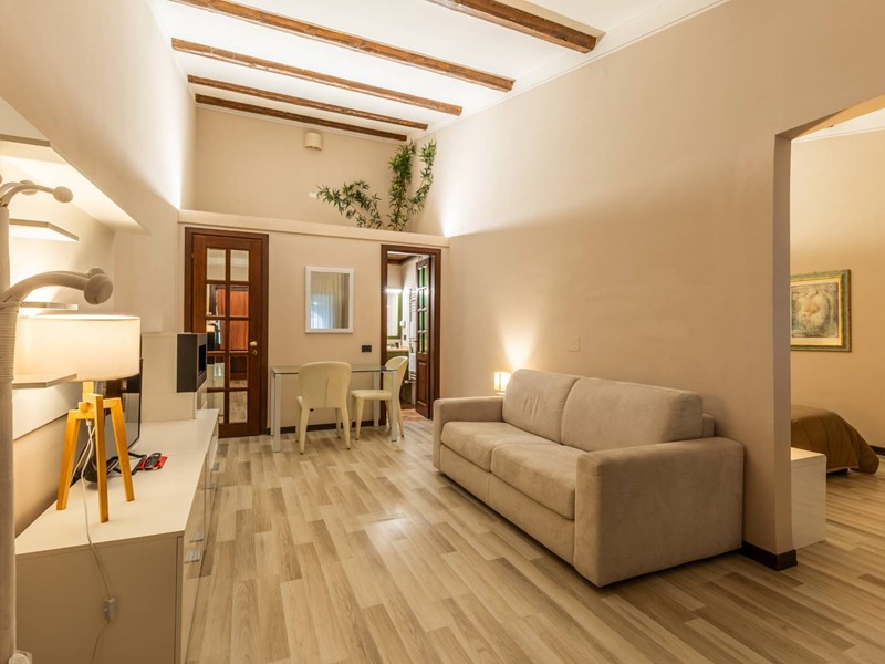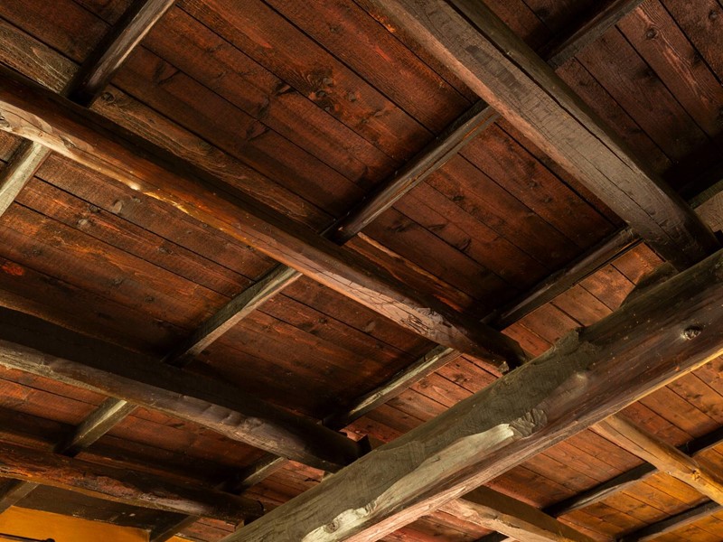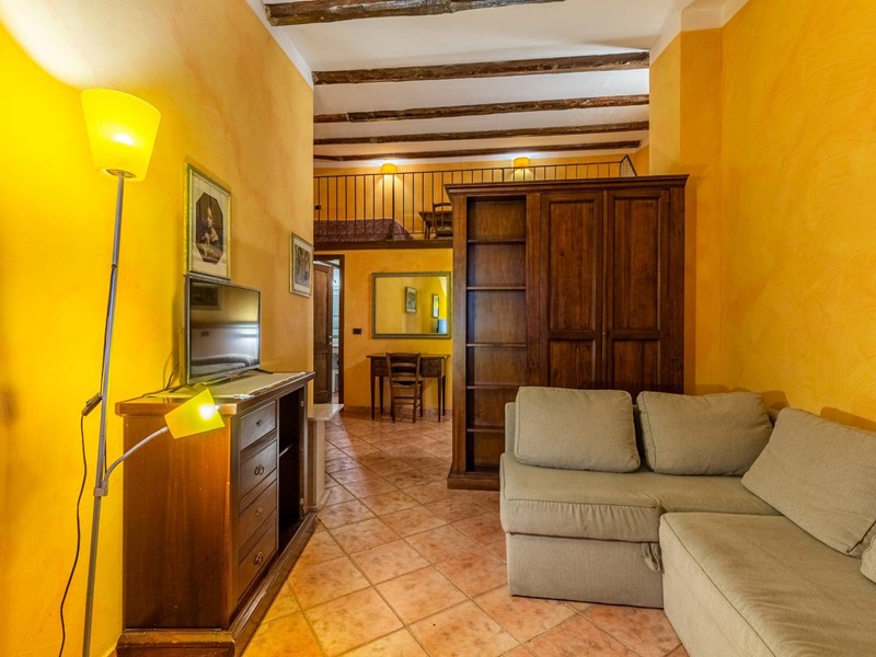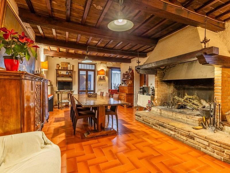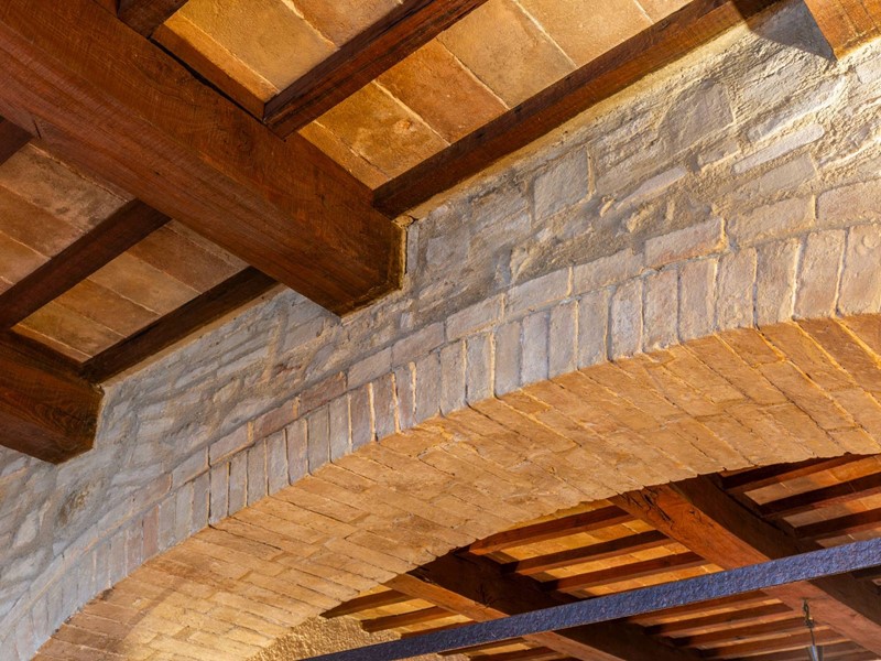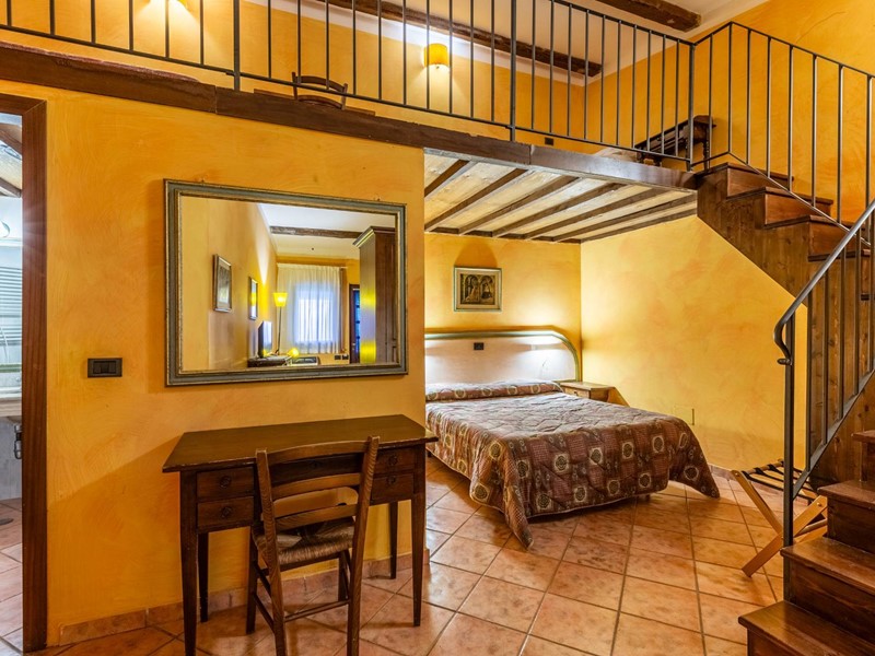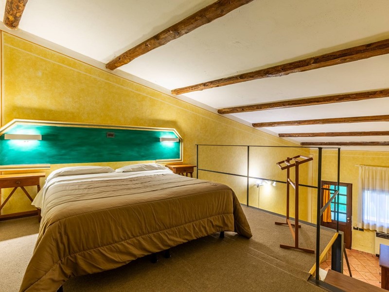 Gli interni, caratterizzati da travi in legno a vista, pavimenti in cotto, parquet e pareti in pietra, conferiscono un'atmosfera calda e rustica.