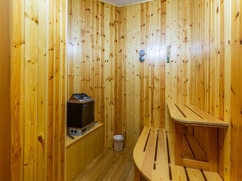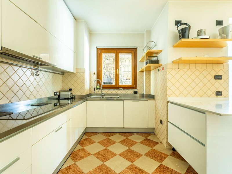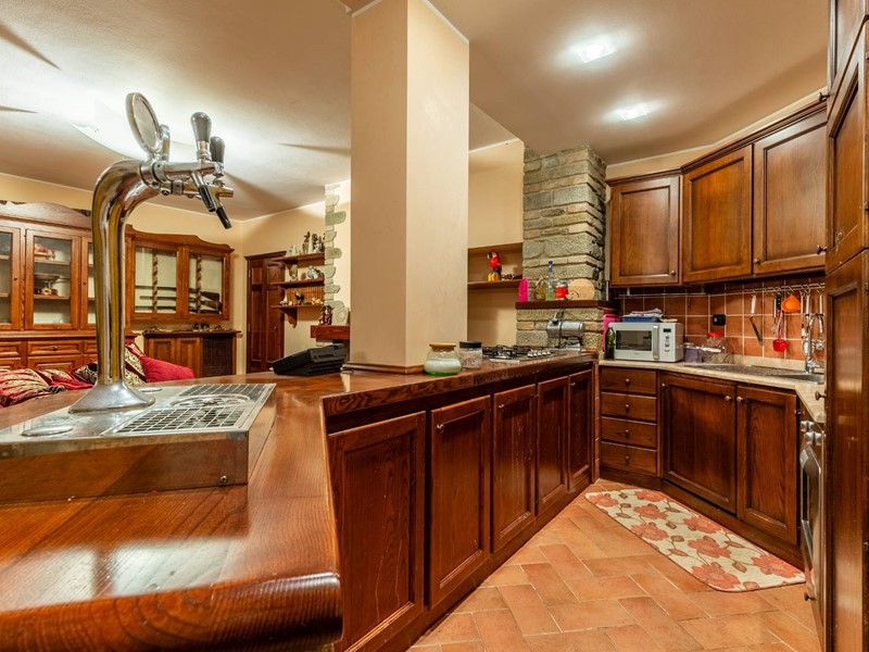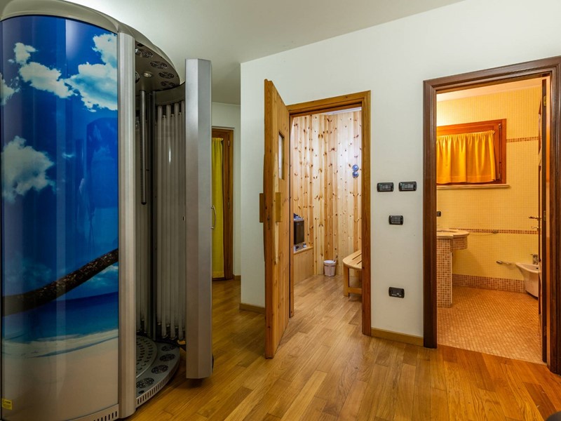 Un moderno ascensore collega comodamente il piano terra con il piano inferiore nel quale si trovano un ampio box auto attualmente adibito a sala, una zona dedicata al benessere con sauna e doccia solare, un bagno e un grande salone rustico con cucina ideale per momenti conviviali.