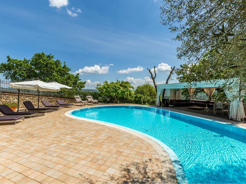 Il cuore pulsante della proprietà è lampio giardino curato nei minimi dettagli, arricchito da alberature ornamentali e aiuole fiorite, dove trova dimora una splendida piscina, scenograficamente illuminata di notte. Larea solarium con lettini e gazebo crea unatmosfera rilassante e riservata, perfetta per momenti di assoluto benessere allaperto.