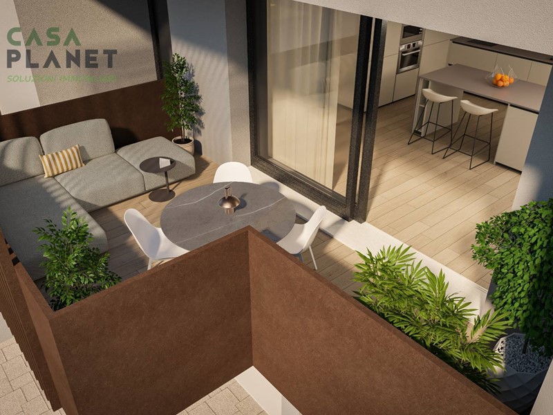 L'appartamento è suddiviso tra una zona giorno di quasi 39 mq. con cucina a vista. Dal soggiorno attraverso una grande portafinestra si accede ad uno spazioso terrazzo di 15 mq.