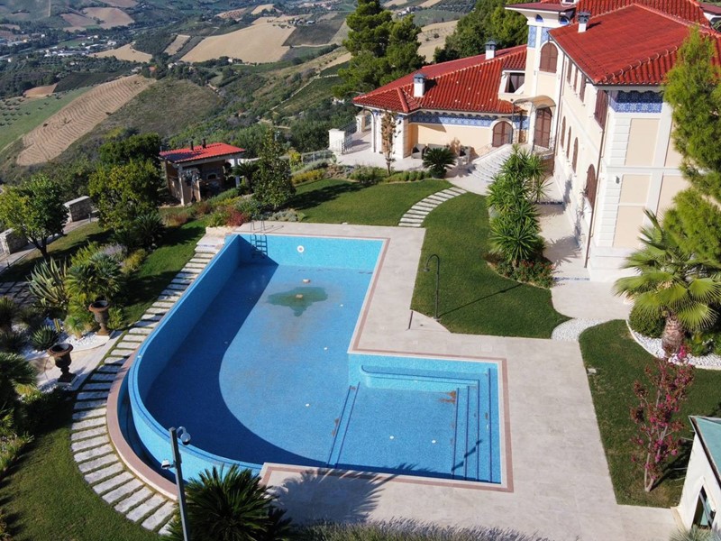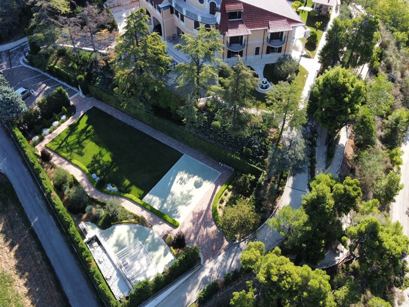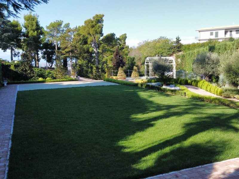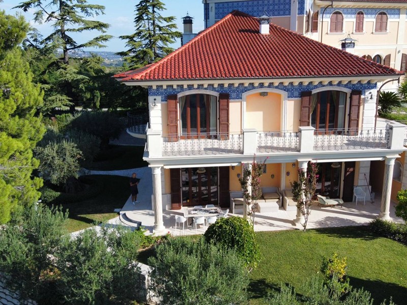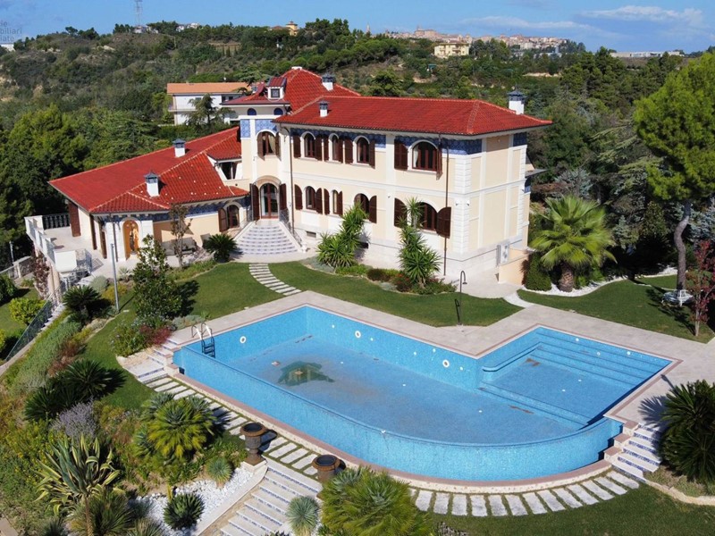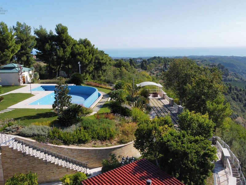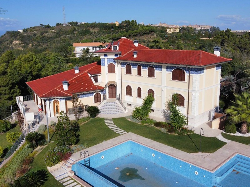 Prestigiosa villa delle dimensioni complessive di 680 mq. circa disposta su 3 livelli e composta di:° piano terra composto di ingresso su vano scala di collegamento ai piani superiori, ampio sala da pranzo con zona cottura, tinello, salottino e bagno oltre scala di servizio di collegamento al primo piano° piano primo completo di ampio salone e zona notte con 5 camere matrimoniali e tre bagni;° piano secondo completo di quattro camere oltre 2 servizi igienici;°completa la proprietà un garage al piano terra sufficente per tre autovetture oltre ad un mezzaziono adibito ad appartamentino. La villa è fornita inoltre di uno stupendo parco di circa 16.400 mq in parte piantumato a giardino e in parte agricolo. La villa è fornità di una lussuosa piscina con vista mare. L'immobile si presenta in buono stato di conservazione, con finiture di lusso. Ubicata nella fascia collinare sopra Grottammare. Adatta ad ospitare più nuclei familiari.