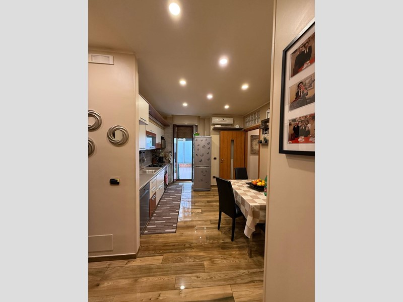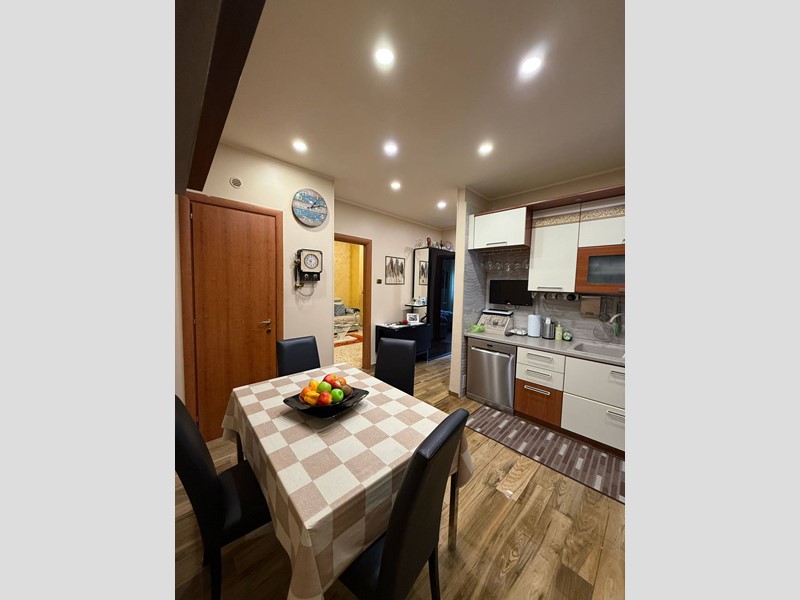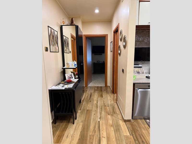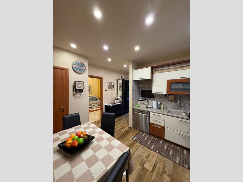 L'appartamento si apre su un accogliente ingresso che conduce alla cucina con ripostiglio, pratica e funzionale.