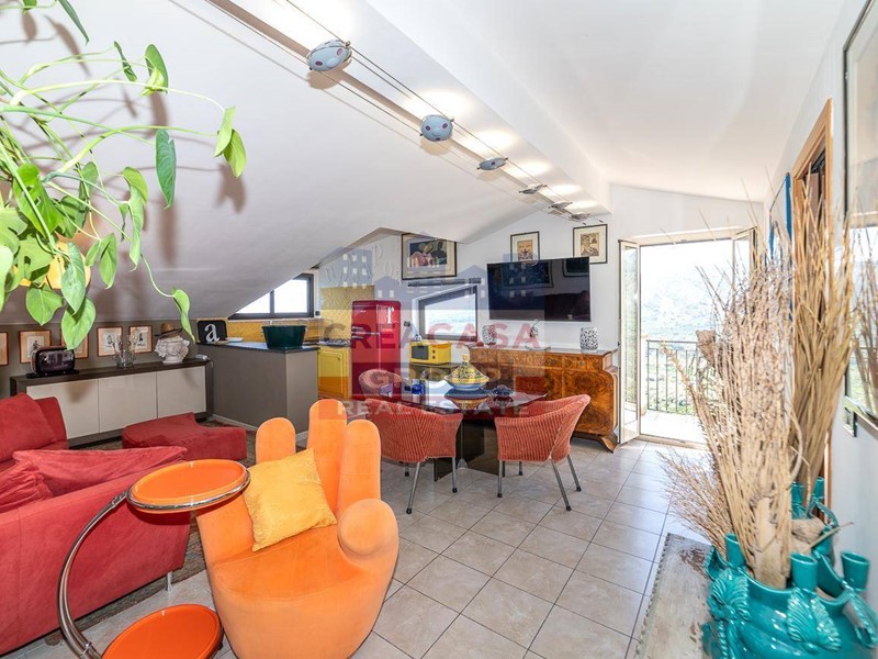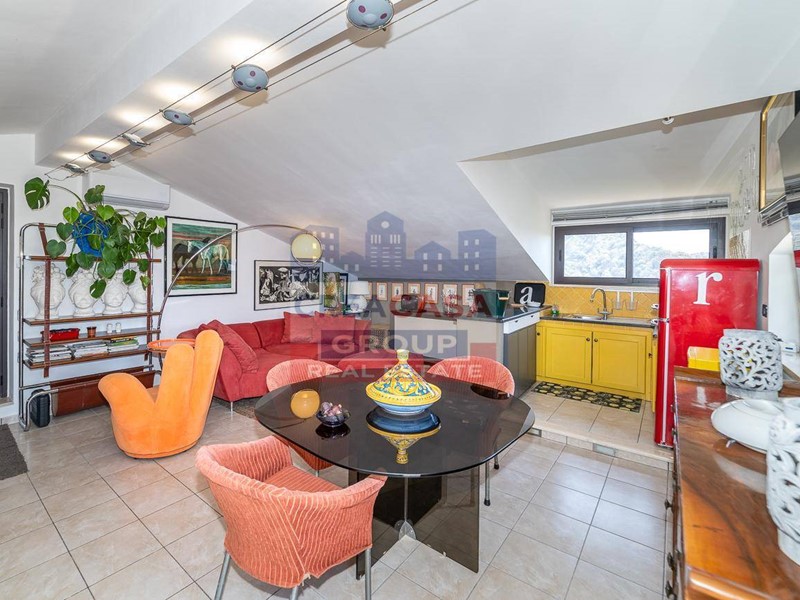 La mansarda al piano superiore, anche questa perfettamente vivibile con ingresso su soggiorno con angolo cottura, camera matrimoniale, bagno e terrazza .