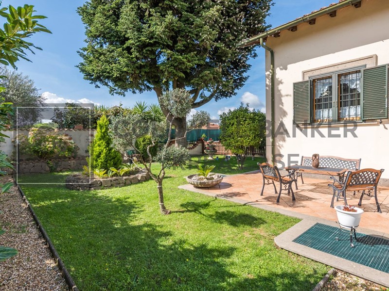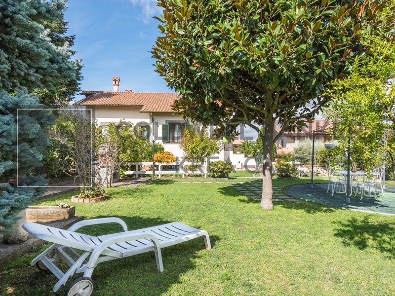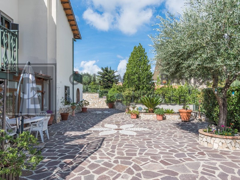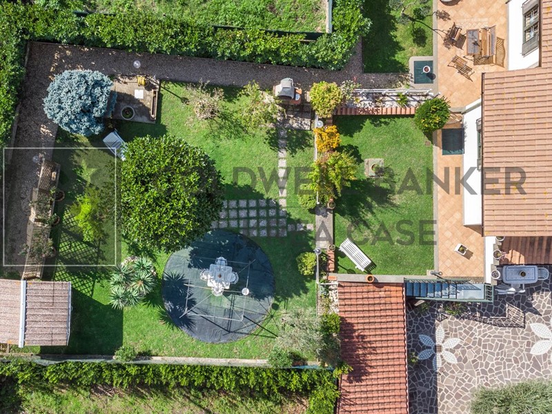 La gradevole superficie esterna sviluppa in totale un'area di circa 900mq e comprende una ampia zona a giardino molto curata e godibilissima in estate, un'area pavimentata con Porfido che dona all'esterno uno scenografico effetto di prestigio, zone porticate prospicenti alla zona giorno che enfatizzano la loro godibilità soprattutto in estate ed infine una ampia zona parcheggio in adiacenza all'accesso del box.