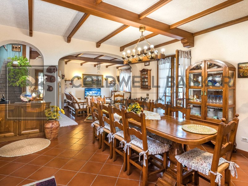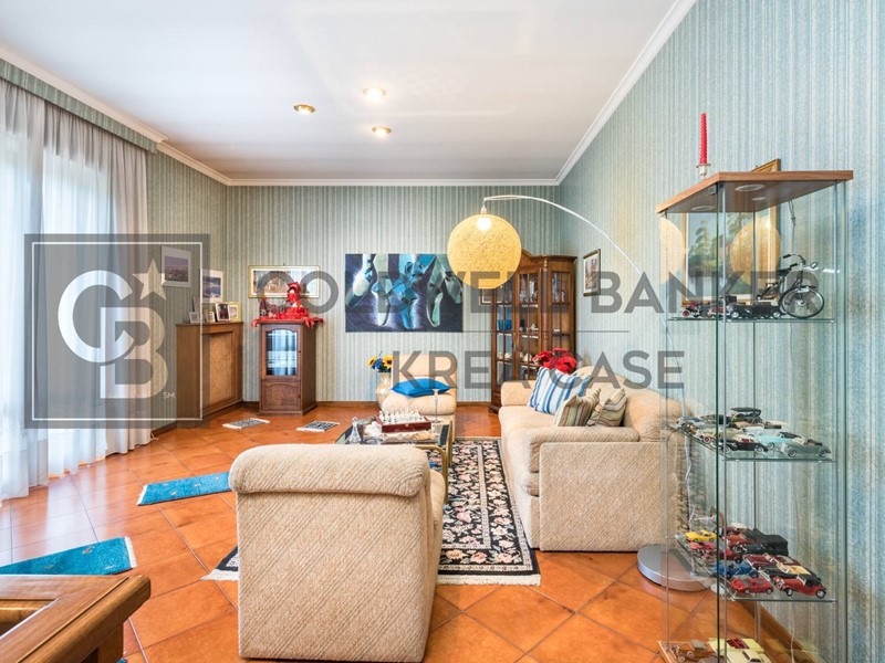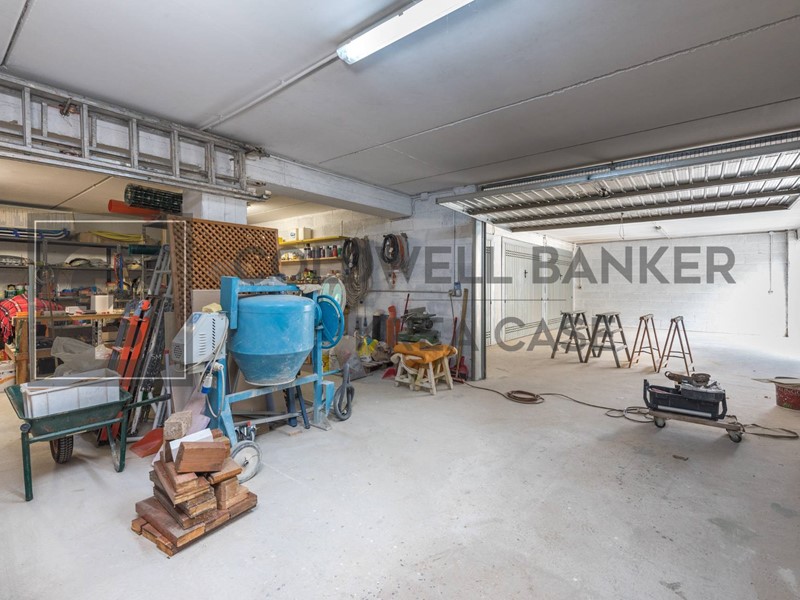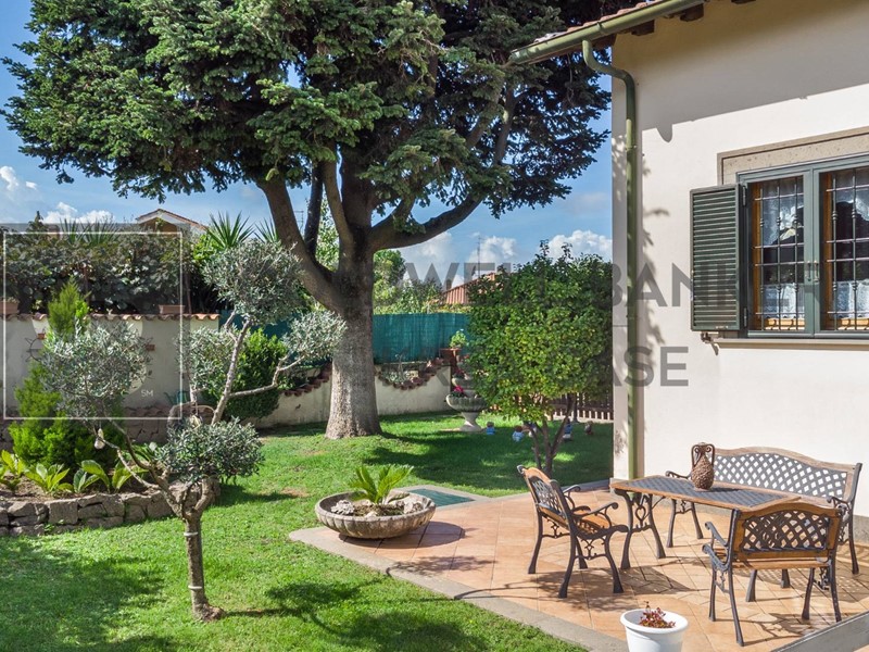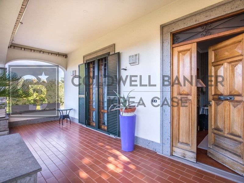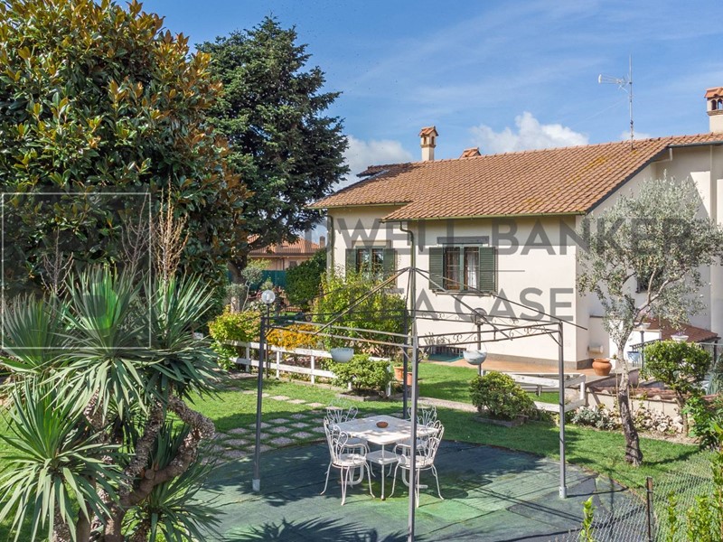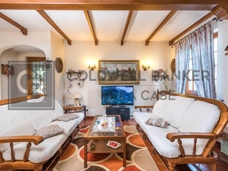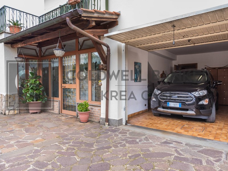 Internamente la Villa dispone al piano terra di un ampio ingresso al quale si accede attraverso una gradevole area porticata, un comodo soggiorno direttamente collegato alle superfici esterne, una cucina abitabile munita di camino attualmente adibita camera da letto dai proprietari, una camera matrimoniale, una camera doppia e doppi servizi. L'abitazione si completa nel piano sottostante, nel quale trovano spazio un salone doppio con camino collegato con portefinestre al giardino, una ampia cucina a vista in muratura, una dispensa, una stanza finestrata adibita a cameretta, una cantina ed il servizio del piano; da questo piano si ha accesso diretto al box auto. La proprietà infine dispone di due box auto uniti internamente in un unico ambiente di circa 30mq con ingresso indipendente dalla strada e collegato al parco della Proprietà tramite viale pedonale.