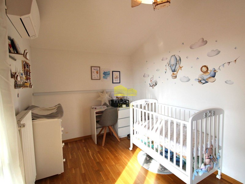Tramite scala si accede alla zona notte, dove troviamo camera matrimoniale e cameretta con entrambe l'accesso su secondo TERRAZZO di circa 38 mq con pergola a norma che copre metà della superficie e ampio bagno doppiamente finestrato con doppio lavabo, sanitari sospesi, vasca con box doccia e accesso su balcone.