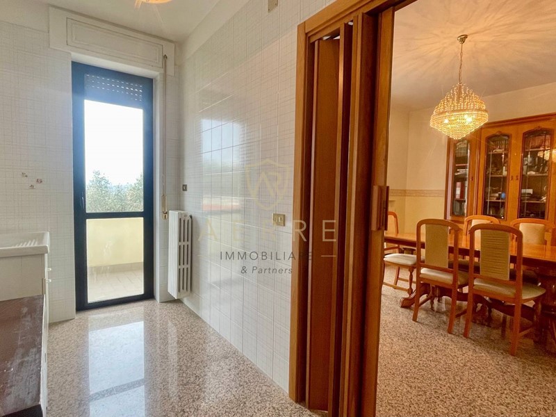 Dal portoncino, ubicato al primo piano della gradinata comune, si entra in uno spazio dingresso che conduce ad un tinello con camino e annesso cucinotto separato; di fronte a questo ambiente troviamo un living che affaccia su una bella balconata panoramica.