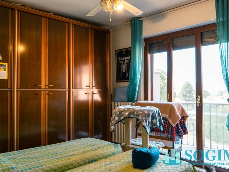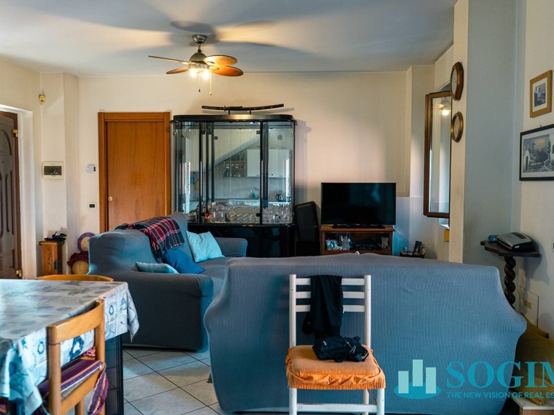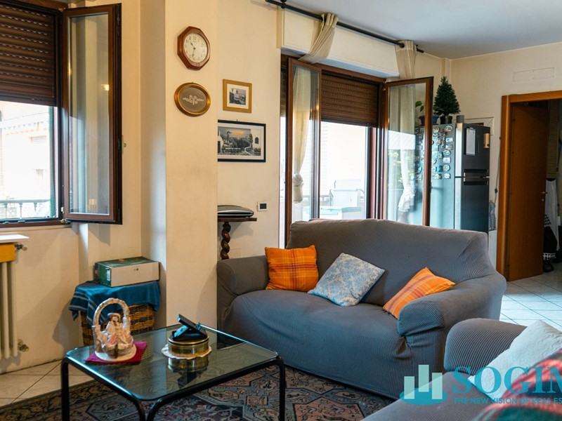 L'appartamento ha una doppia esposizione nord- ovest ed è composto dall'ingresso che si apre sul soggiorno con cucina a vista, con accesso ad un ampio balcone; un piccolo disimpegno conduce alla zona notte costituita dalla prima camera da letto e dal bagno finestrato dotato di doccia.