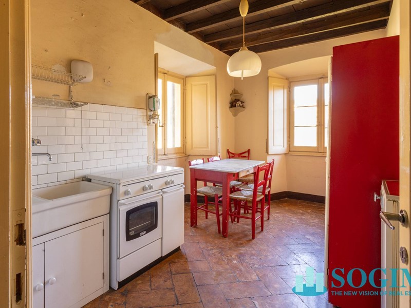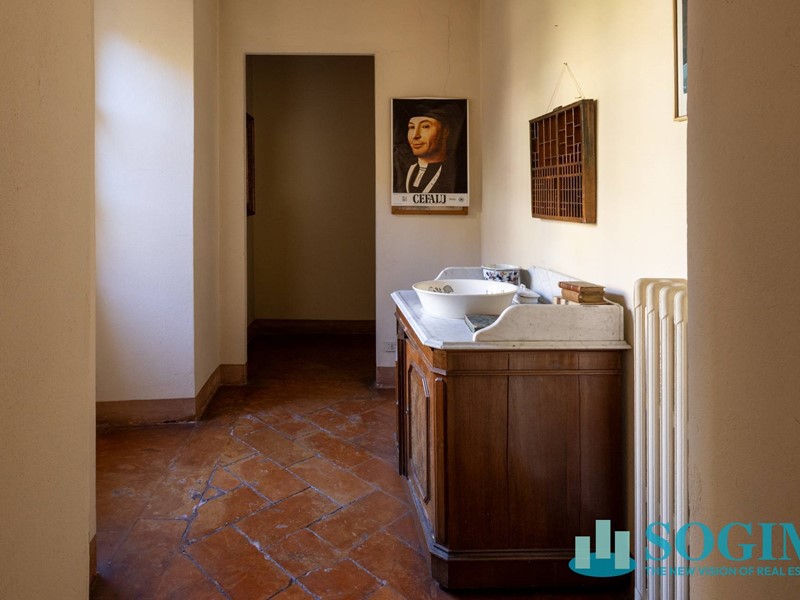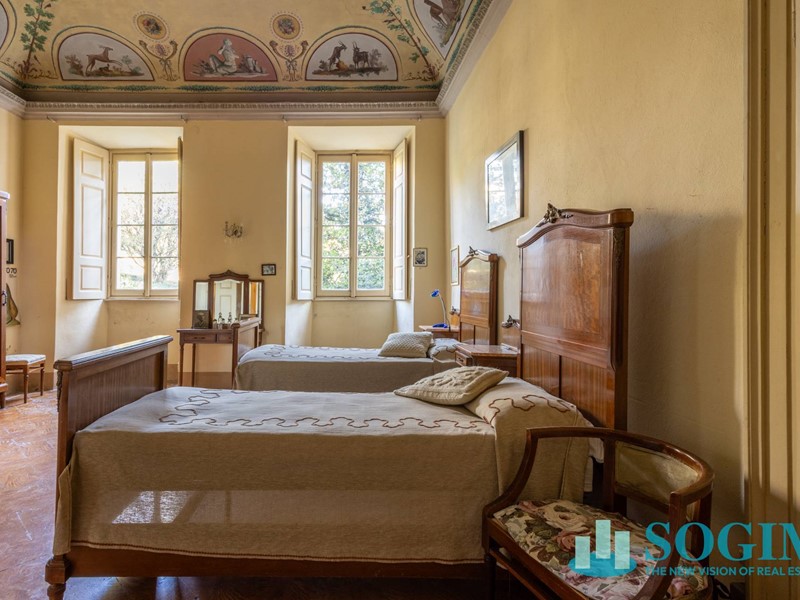 L'ampia scala in pietra conduce al piano primo ove sono ubicate 4 ampie camere matrimoniali di cui una con bagno en suite, un secondo bagno e un disimpegno che permette di accedere al ballatoio comunicante con quella che in passato era la dimora del personale di servizio, comprensiva di una cucina, soggiorno, due stanze da letto, un bagno ed accessibile anche da un ulteriore e separato vano scala.