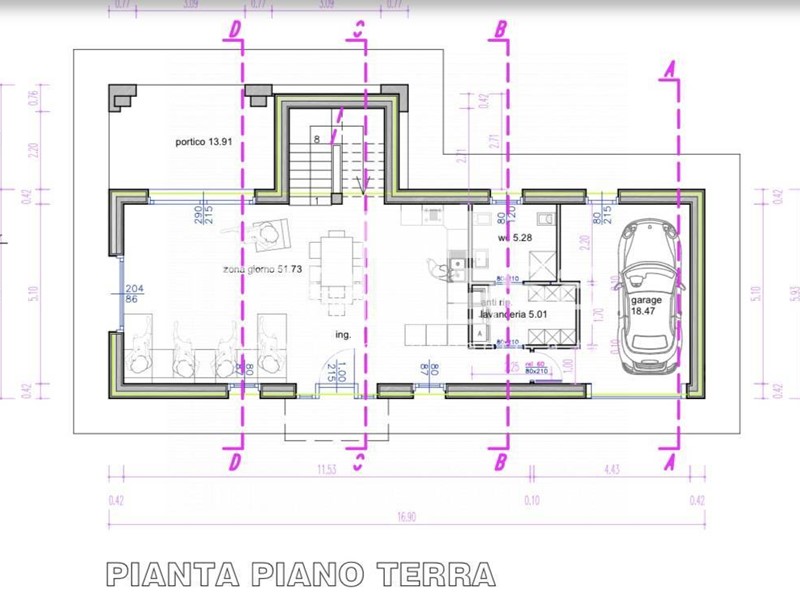 Al piano terra zona giorno di 52 mq. open space da suddividere secondo le proprie esigenze con affaccio su porticato a doppia altezza, bagno con doccia, lavanderia/c.t. e garage per un'auto.