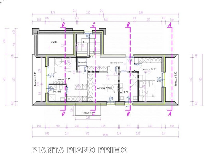 Al piano primo camera matrimoniale con bagno privato e guardaroba, due camere matrimoniali, di cui una con terrazzo lungo il lato Est e un terzo bagno con doccia.