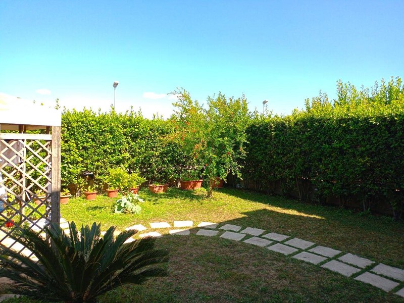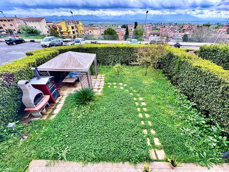 Al piano terra, troviamo un ampio salone con cucina a vista e un bagno, tutto il piano è circondato da un giardino di 150 mq accessoriato con un gazebo, un barbecue e un forno a legna.