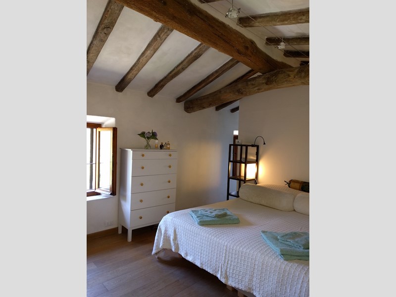 - Camera matrimoniale con travi a vista in castagno. Due finestre, una con vista sul giardino e sulla campagna circostante e l'altra sulla terrazza al primo piano.