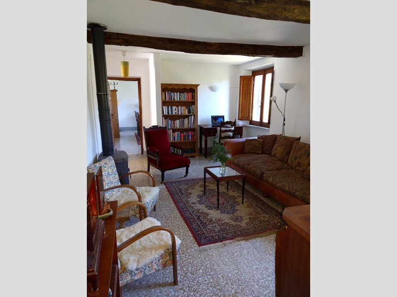 - Salotto con stufa a legna. Travi di castagno esposte. Due finestre con splendide viste sul giardino e sulla campagna circostante.