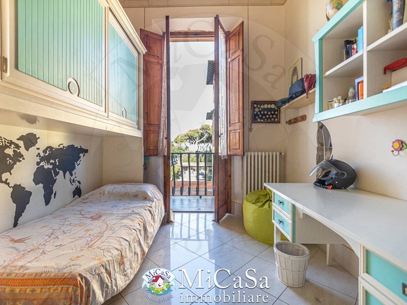 In posizione residenziale e riservata, proponiamo porzione di prestigioso appartamento in duplex in stile Liberty. Da ingresso indipendente al piano terra si accede all'ampia scala padronale che conduce al primo piano dove si sviluppa l'abitazione, composta da ampio ingresso trazionale affrescato, luminoso salone con doppio affaccio vista mare, cucina abitabile con camino, camera matrimoniale, camera media con soppalco e camera singola con accesso al balcone vista a mare, bagno con finestra dotato di vasca e doccia, un bagno di servizio con finestra, utile anche come lavanderia, oltre ad un vano ad uso studio con scala tradizionale per accedere alla grande mansarda, completamente ristrutturata, attualmente divisa in più stanze pluriuso, oltre che ad un comodo bagno completo di doccia.