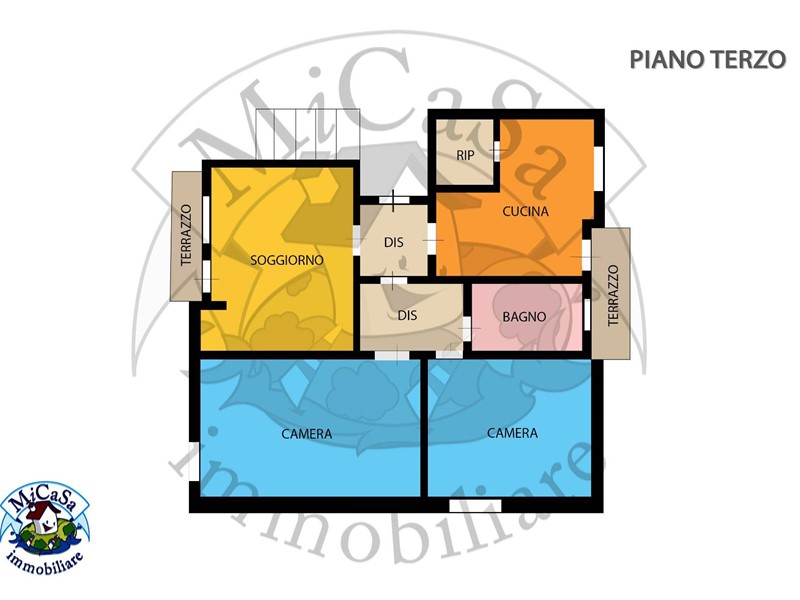 Sito al terzo piano senza ascensore, si compone di : ingresso, soggiorno, cucina abitabile con ripostiglio, due camere matrimoniali, bagno finestrato e due balconi accessibili dalle zone giorno.