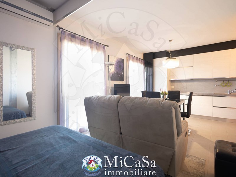 Lingresso si apre su un luminoso locale con cucina a vista, creando un ambiente accogliente e versatile. Larredamento, curato nei minimi particolari, include un comodo letto, un armadio funzionale e un elegante divano in pelle, per un mix di stile e comfort. Il bagno, spazioso e ben rifinito, è dotato di una ampia doccia, mentre una splendida terrazza completa lesperienza, offrendoti uno spazio allaperto dove rilassarti.