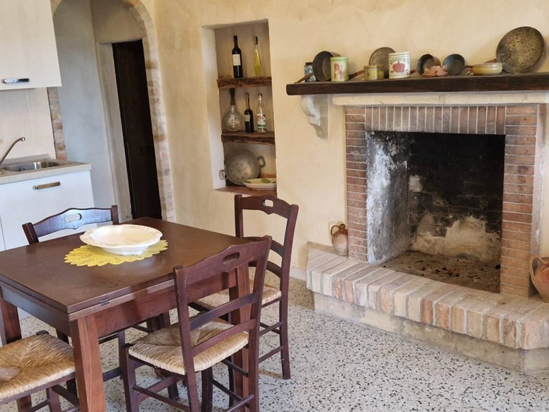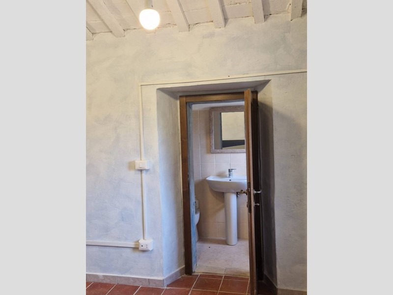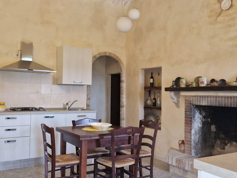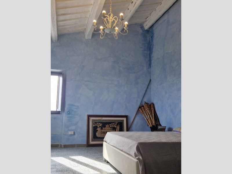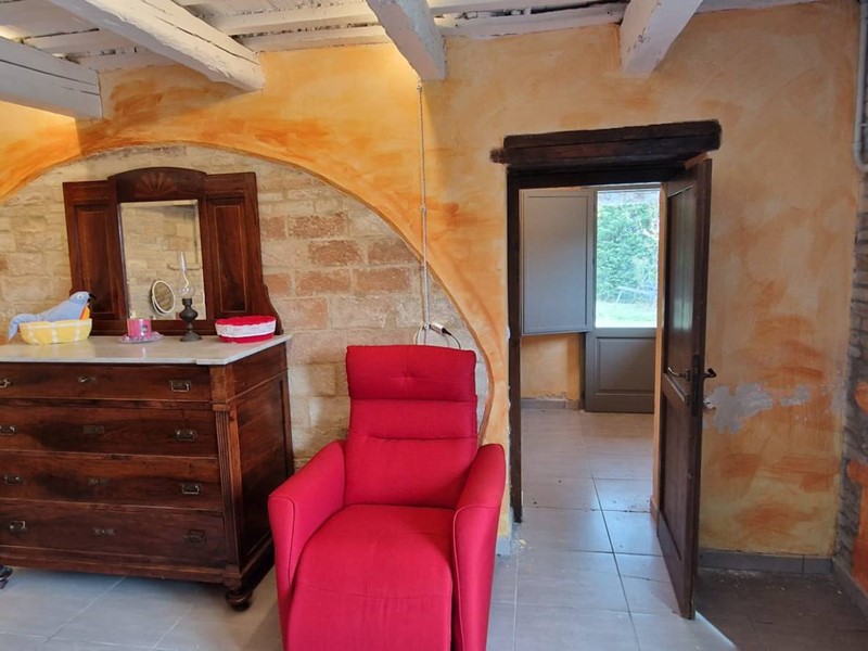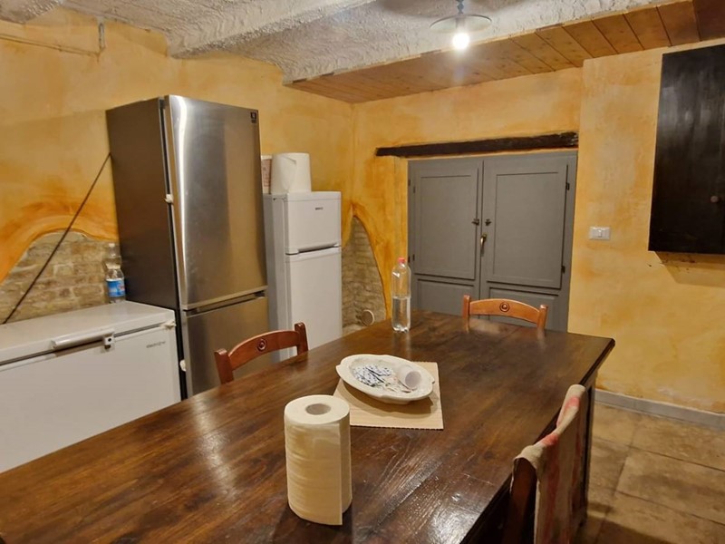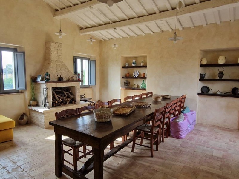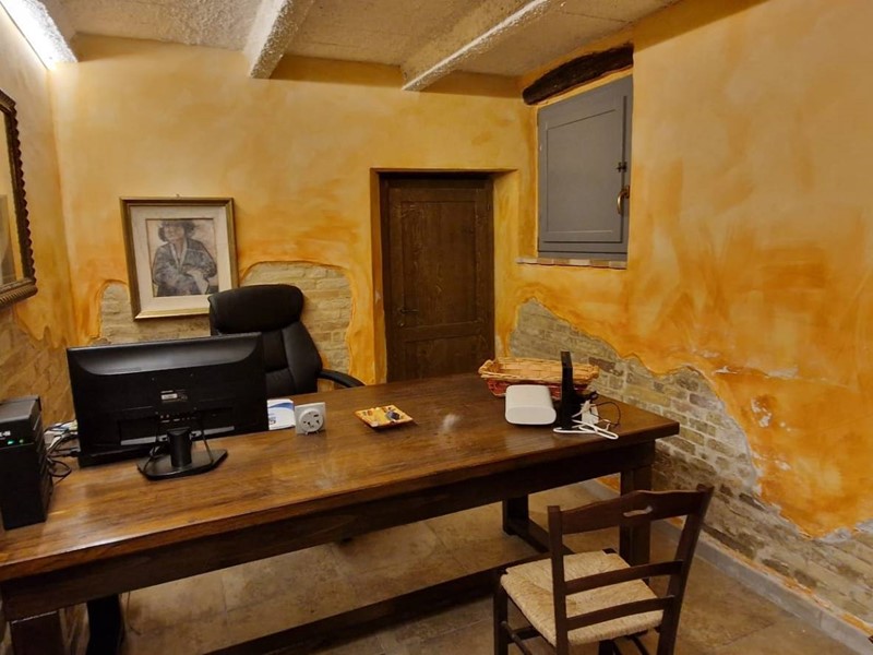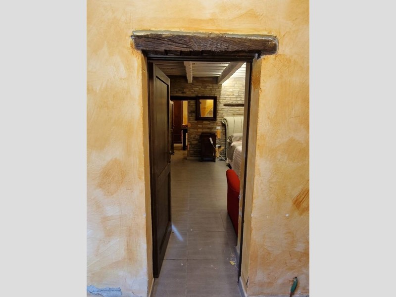 - Piano terra : ingresso su grandissimo salone con travi a vista con bellissimo camino funzionante, costruito con materiali originali antichi e bagno. Cantina/ripostiglio dotata di scaffalature di prestigio e porta di uscita secondaria che porta all'esterno dal lato posteriore del casale. Singolare stanza adibita ad ufficio, ampia cucina sempre con uscita verso l'esterno. Camera matrimoniale con bagno finestrato e stanzino guardaroba con porta d'uscita verso il cortile esterno in direzione ovest.