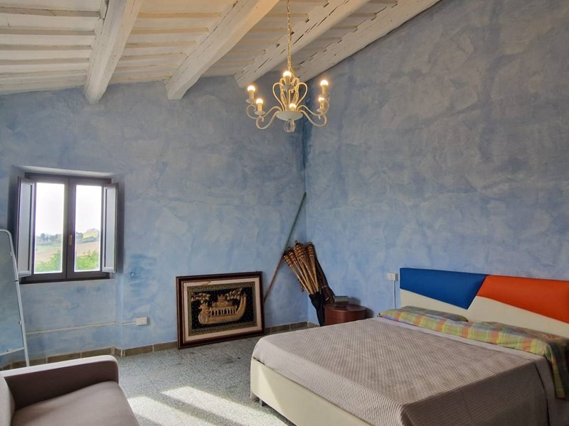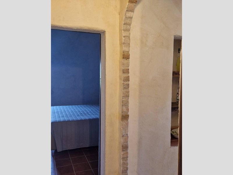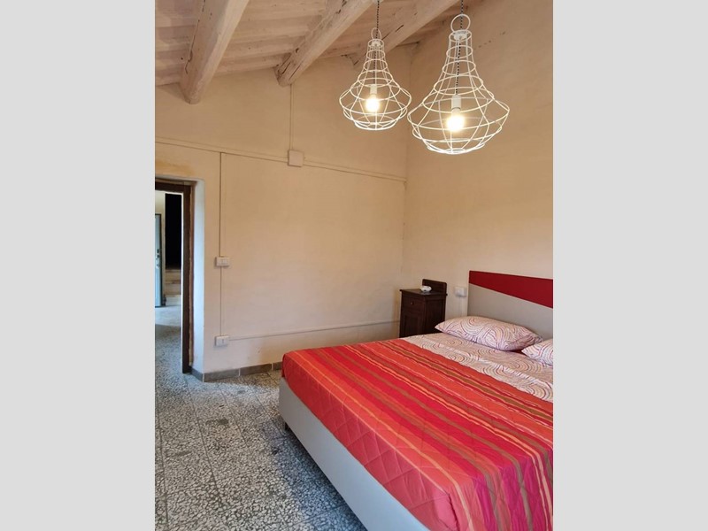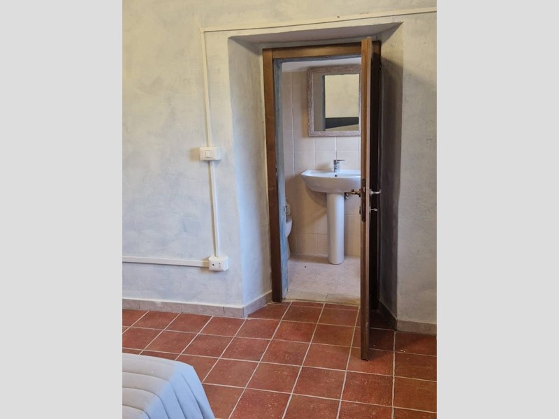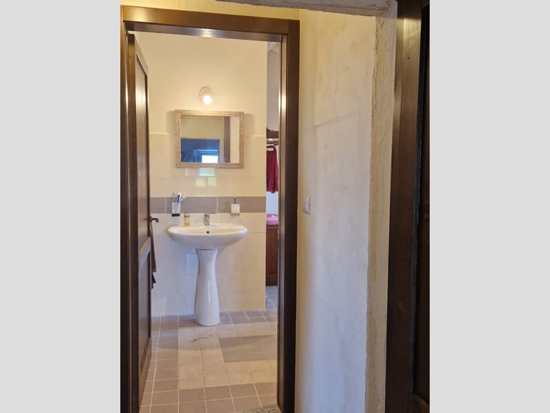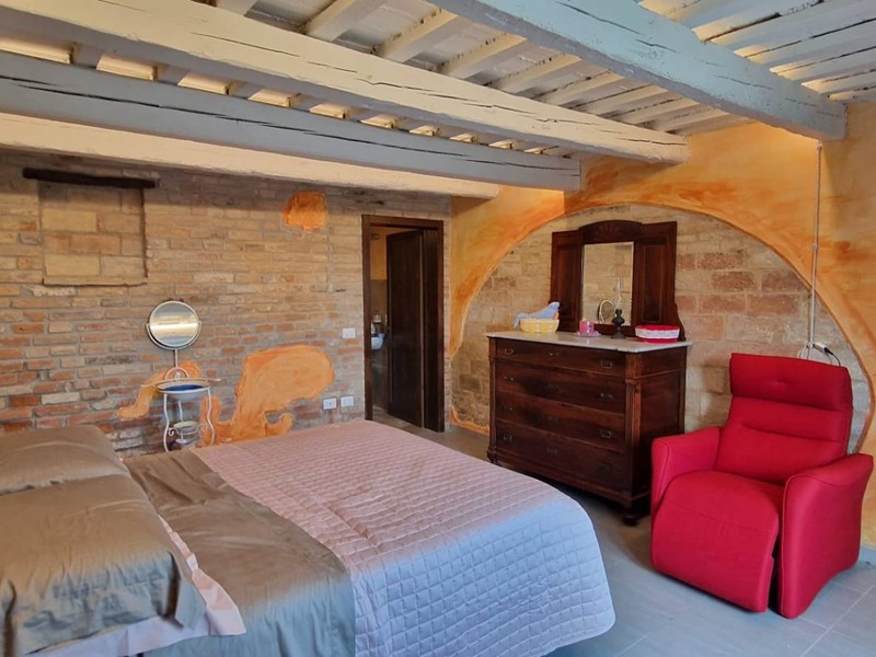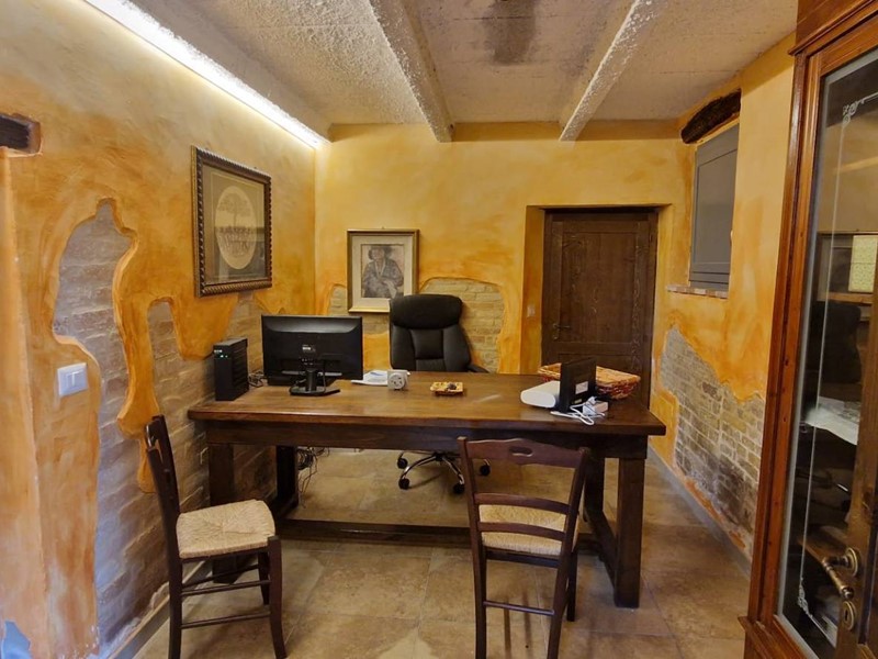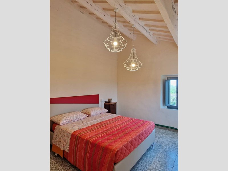 - Piano terra : ingresso su grandissimo salone con travi a vista con bellissimo camino funzionante, costruito con materiali originali antichi e bagno. Cantina/ripostiglio dotata di scaffalature di prestigio e porta di uscita secondaria che porta all'esterno dal lato posteriore del casale. Singolare stanza adibita ad ufficio, ampia cucina sempre con uscita verso l'esterno. Camera matrimoniale con bagno finestrato e stanzino guardaroba con porta d'uscita verso il cortile esterno in direzione ovest.