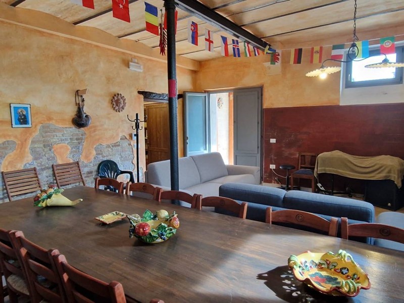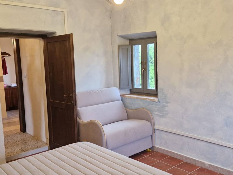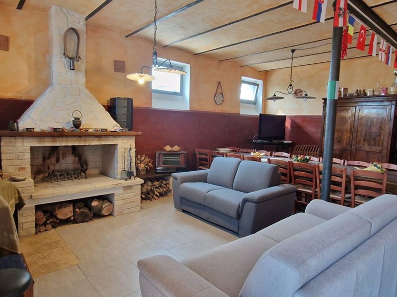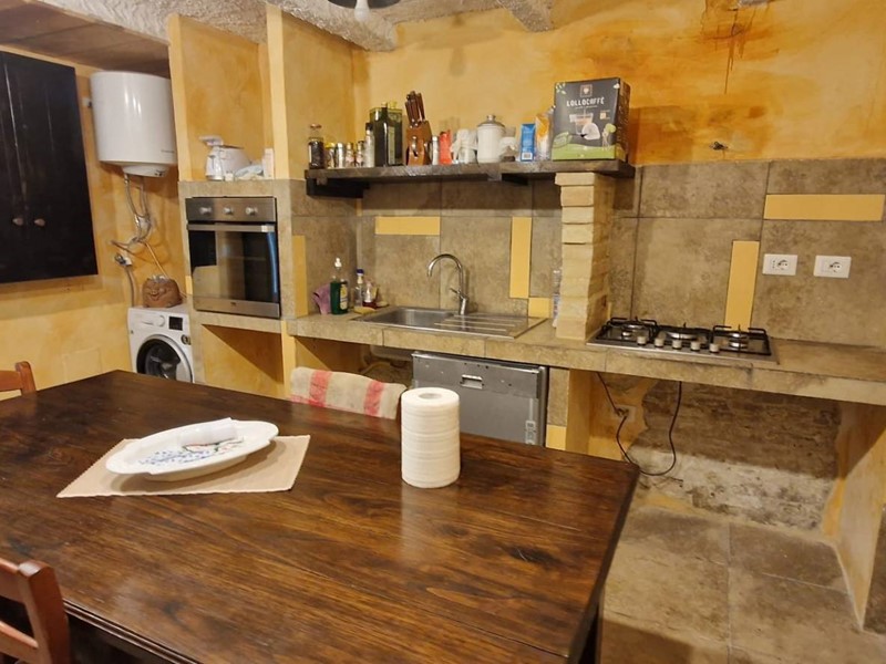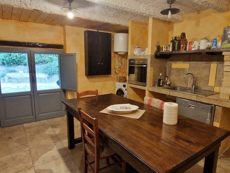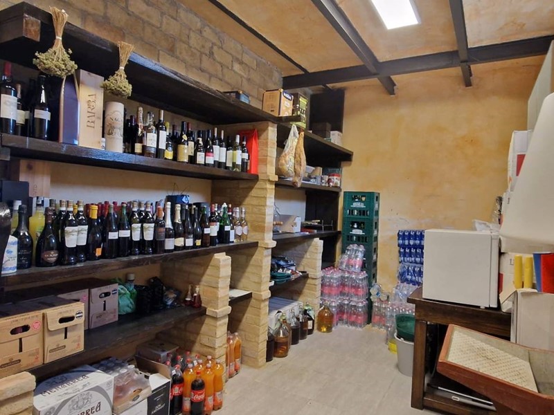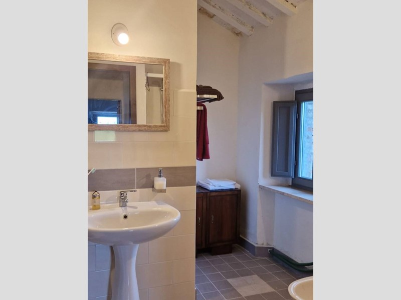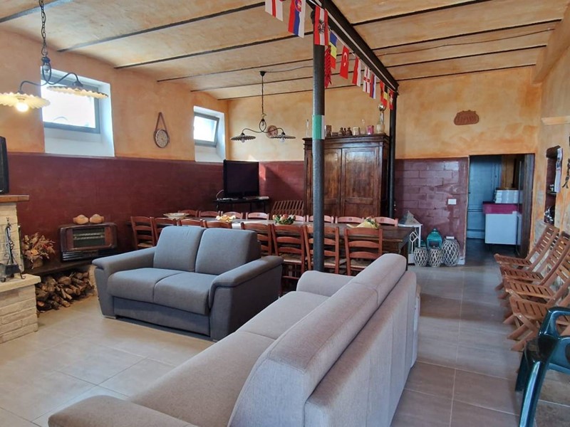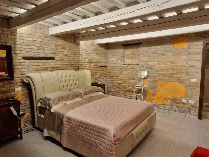 - Piano terra : ingresso su grandissimo salone con travi a vista con bellissimo camino funzionante, costruito con materiali originali antichi e bagno. Cantina/ripostiglio dotata di scaffalature di prestigio e porta di uscita secondaria che porta all'esterno dal lato posteriore del casale. Singolare stanza adibita ad ufficio, ampia cucina sempre con uscita verso l'esterno. Camera matrimoniale con bagno finestrato e stanzino guardaroba con porta d'uscita verso il cortile esterno in direzione ovest.