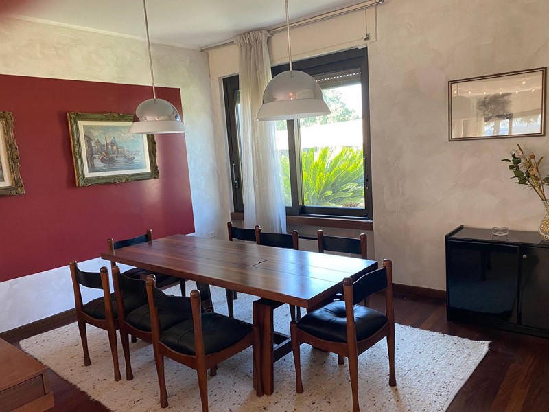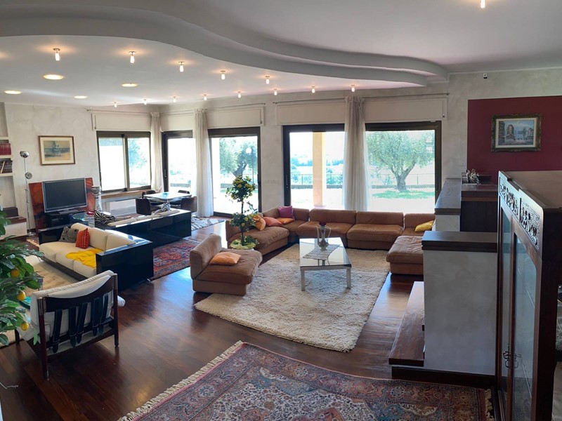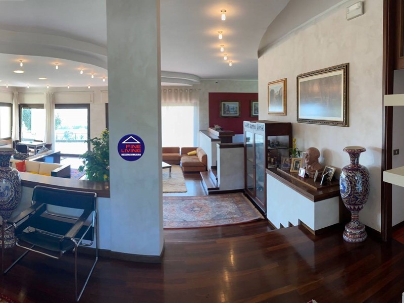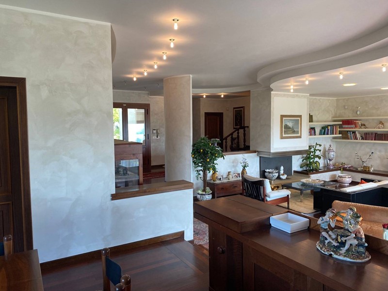 Al piano terra immensa zona giorno di circa 95 mq. con pareti vetrate e scorrevoli che si aprono sul porticato e sul giardino; il soggiorno è suddiviso in varie zone adibite a zona pranzo e zona relax con camini al centro. Sempre al piano terra cucina abitabile e bagno e reparto notte composto da tre camere matrimoniali, una camera doppia e due bagni.