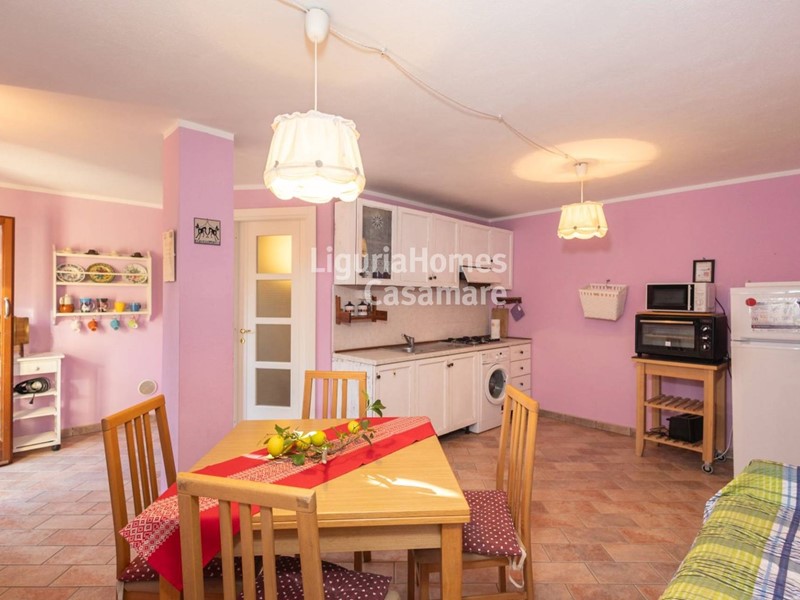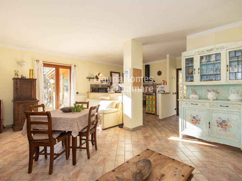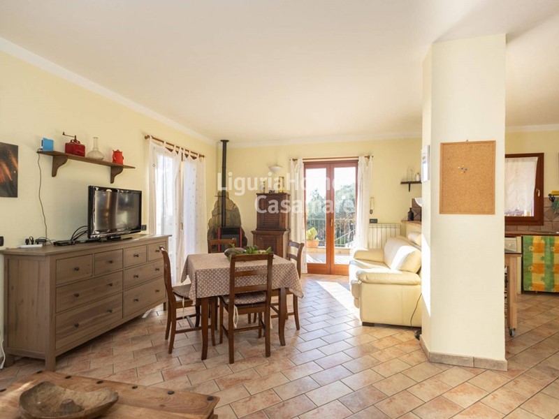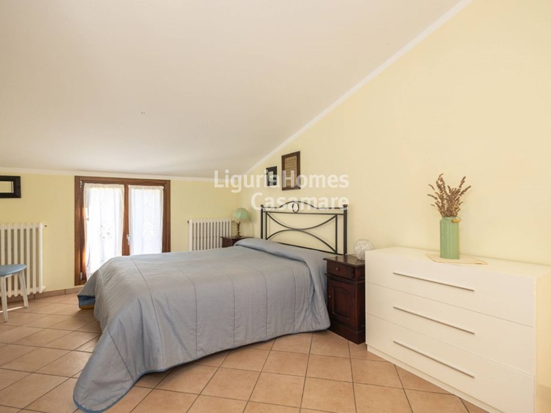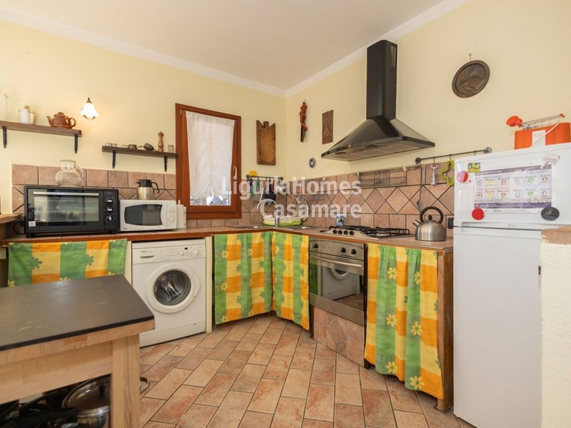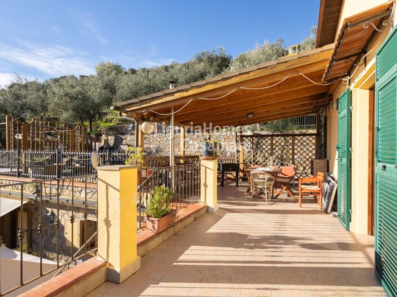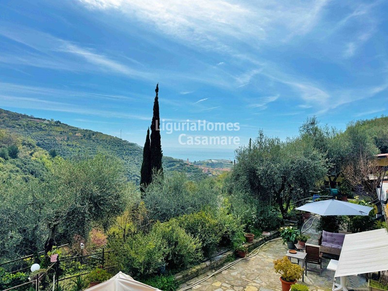 Questa elegante casa di paese in vendita a Castellaro, immersa nel verde della prima collina, offre un bel giardino adornato da ulivi e piante ornamentali oltre che una bella vista aperta sul mare.