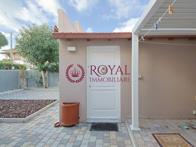 Gli spazi sono ampi e ben distribuiti, garantendo un'atmosfera luminosa e accogliente in ogni ambiente. La villa è composta da un ingresso, salone doppio, con una comoda scala con apertura elettronica per accedere al terrazzo di proprietà di 50 mq circa, atto come solarium o per cene, cucina tinello, con accesso al giardino, bagno finestrato, 2 camere da letto, una camerina con bagno in camera, il tutto con ottimi spazi perfetti per ospitare una famiglia numerosa. Ottime rifiniture. Termo autonomo. Condizionatori. Impianto di allarme. Videocitofono. Infissi PVC con doppi vetri. Zanzariere. Tapparelle elettriche.