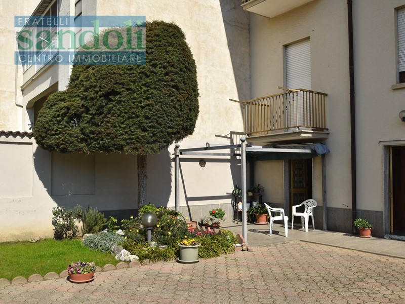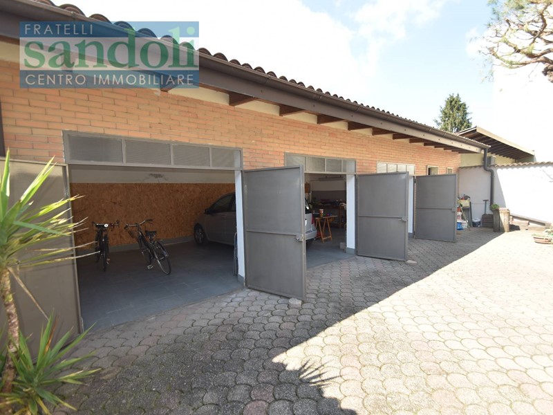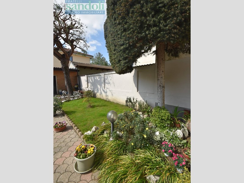 Dal cortile totalmente pavimentato in record decorato, accediamo ad una piccola zona verde, ed al triplo box auto con grande ripostiglio sul laterale.