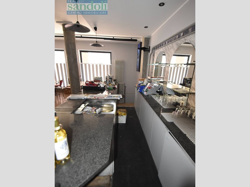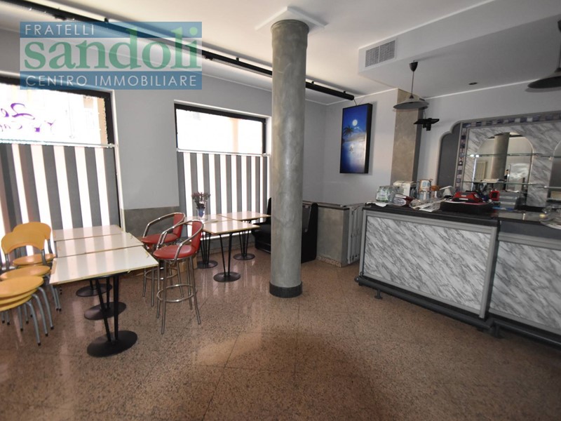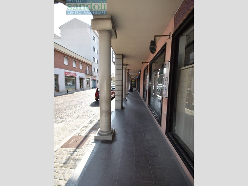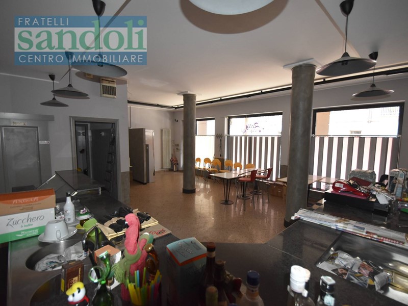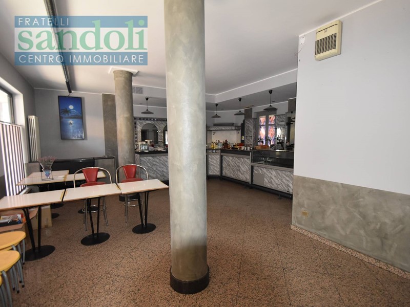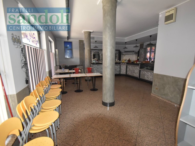 Dal grande porticato con vetrine direttamente su strada ed in zona di forte passaggio, il locale attualmente era utilizzato come bar, con l'arredamento tutt'ora presente, ma escluso dal prezzo di vendita. Si presenta come openspace con pavimentazione in piastrelloni di marmo e due accessi interni, il primo con disimpegno che collega la cucina dotata di finestra con affaccio sul cortile interno, ed il bagno di riferimento del locale, il secondo con scala interna di accesso al piano seminterrato dove è presente un piccolo magazzino da utilizzare come dispensa e cantina.