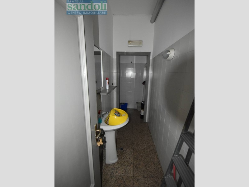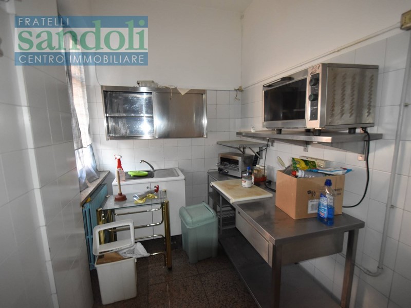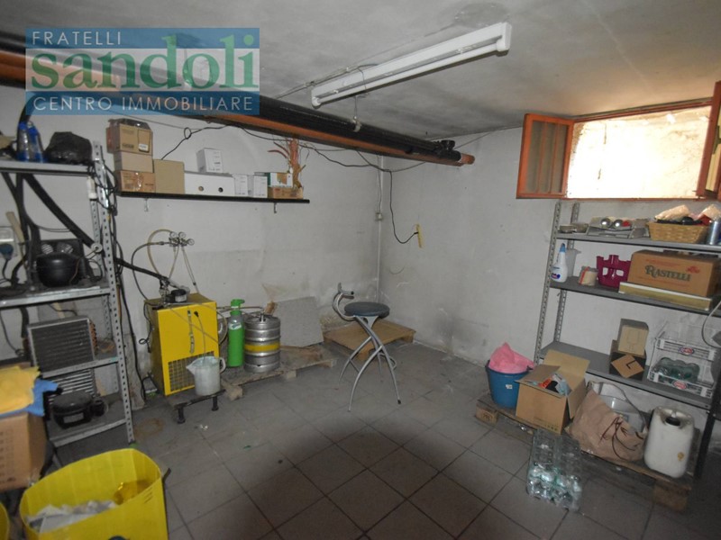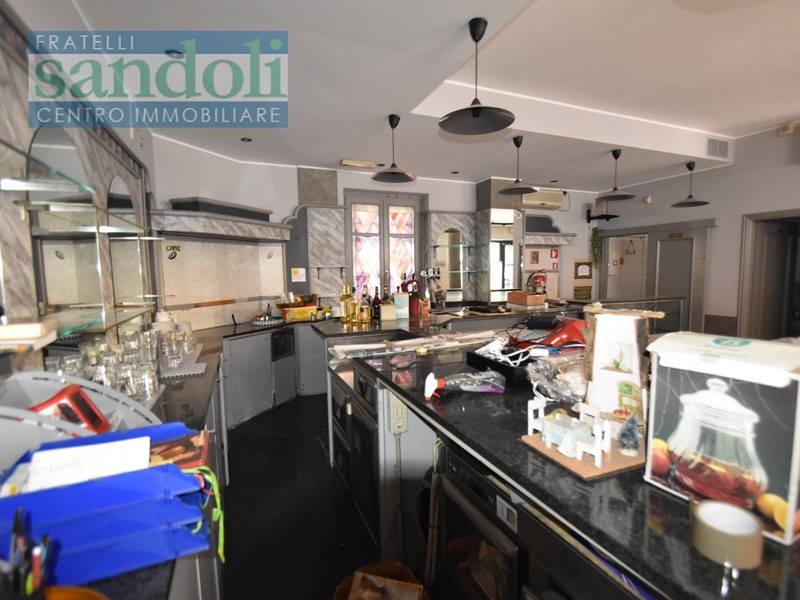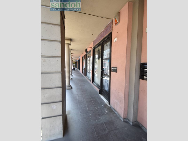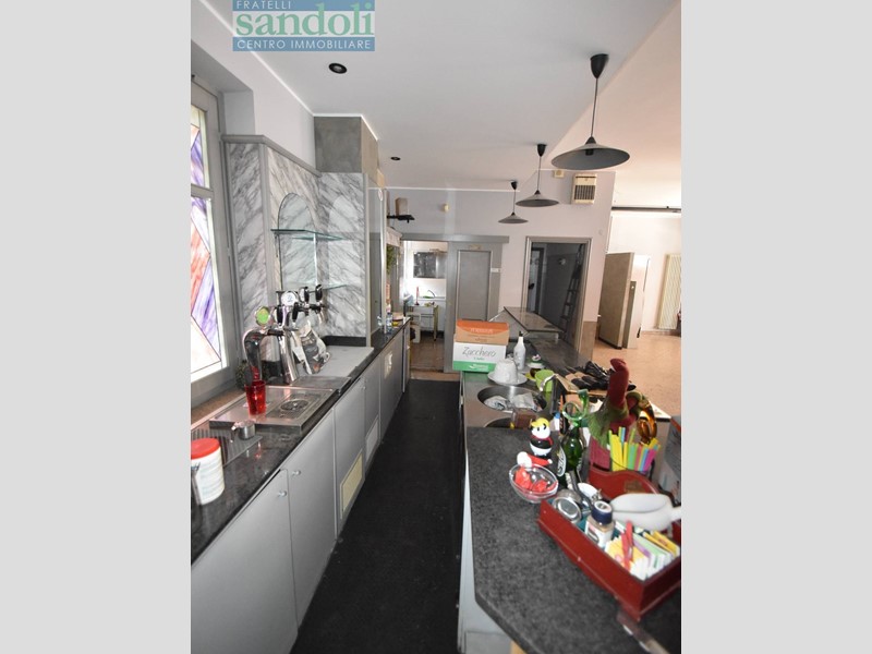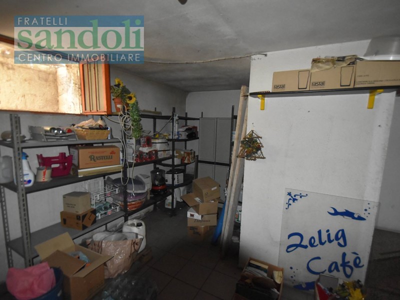 Dal grande porticato con vetrine direttamente su strada ed in zona di forte passaggio, il locale attualmente era utilizzato come bar, con l'arredamento tutt'ora presente, ma escluso dal prezzo di vendita. Si presenta come openspace con pavimentazione in piastrelloni di marmo e due accessi interni, il primo con disimpegno che collega la cucina dotata di finestra con affaccio sul cortile interno, ed il bagno di riferimento del locale, il secondo con scala interna di accesso al piano seminterrato dove è presente un piccolo magazzino da utilizzare come dispensa e cantina.