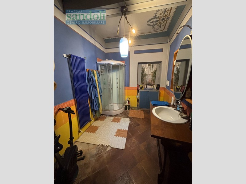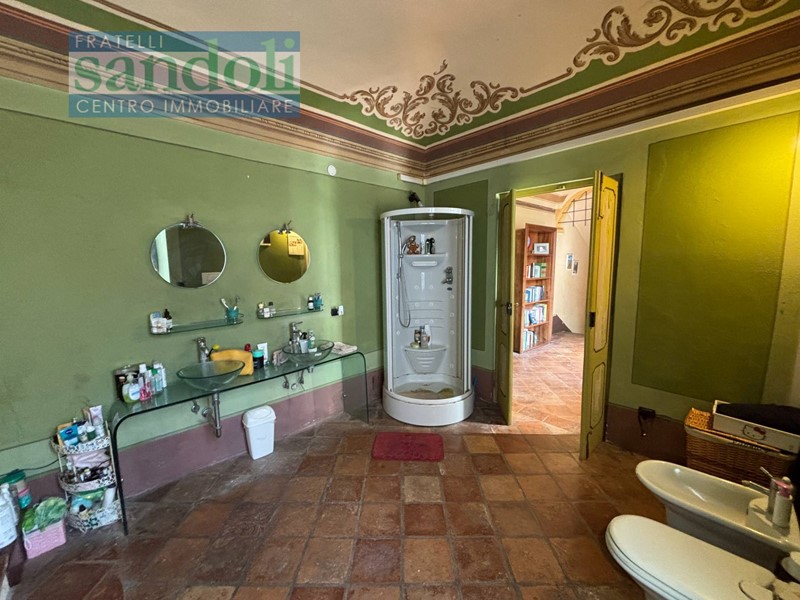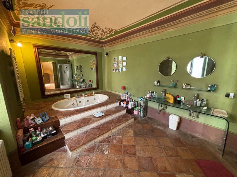 Salendo al primo piano, troviamo un disimpegno, due camere da letto, una pratica cabina armadio e due ulteriori bagni. Il bagno padronale, in particolare, colpisce per le sue finiture classiche e per la presenza di una splendida vasca da bagno con idromassaggio, posizionata di fronte a un grande specchio che amplifica luce e sensazione di relax.