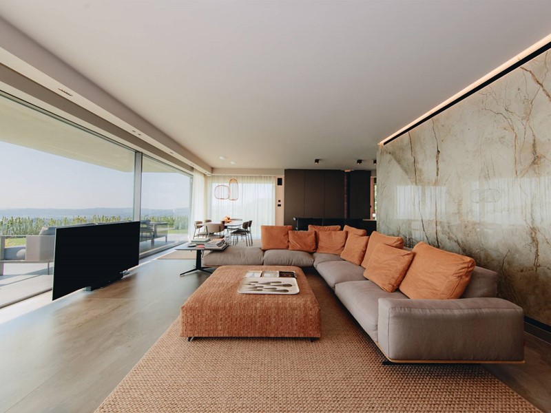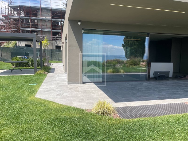 Le Ville sono disposte completamente al piano terra 150 mq per la parte padronale composte da grande zona living con totale vista lago grazie agli infissi in alluminio scorrevoli elettrici, due capienti camere da letto e due bagni.