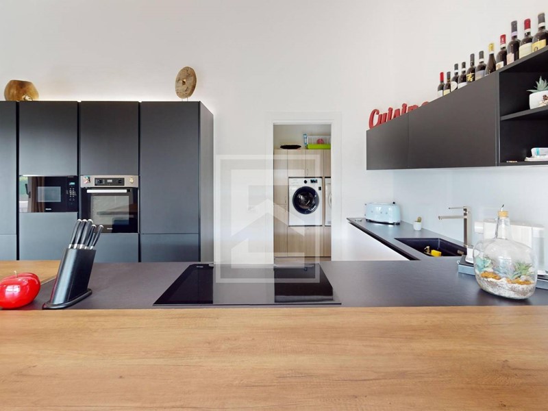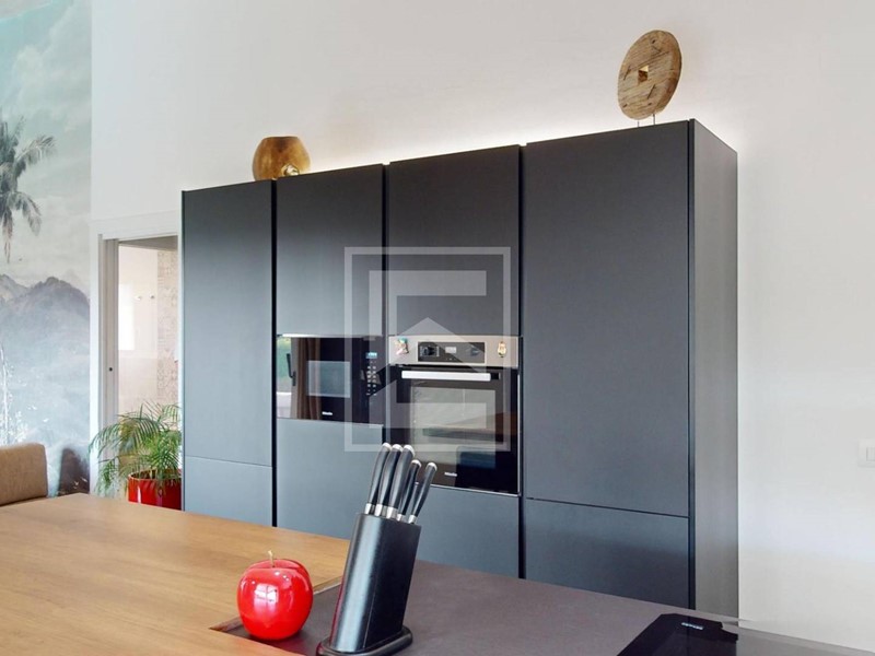 La zona living open accoglie il salotto e la cucina godibili anche dal giardino grazie alle ampie vetrate scorrevoli.