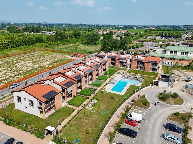 Tutti gli appartamenti godranno di verde condominiale e piscina e vista lago dai piani superiori.