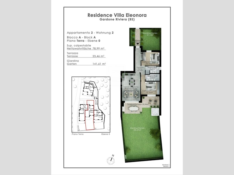 Appartamento trilocale con vista lago di circa 80 mq calpestabili con doppi servizi al piano terra, con giardino privato di circa 142 mq e portico di circa 23 mq.