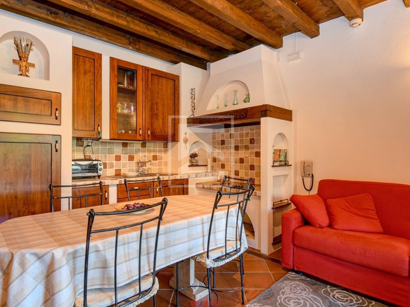 La zona living ha una cucina a vista ben attrezzata e una porta finestra dalla quale si accede al magnifico portico con giardino privato.