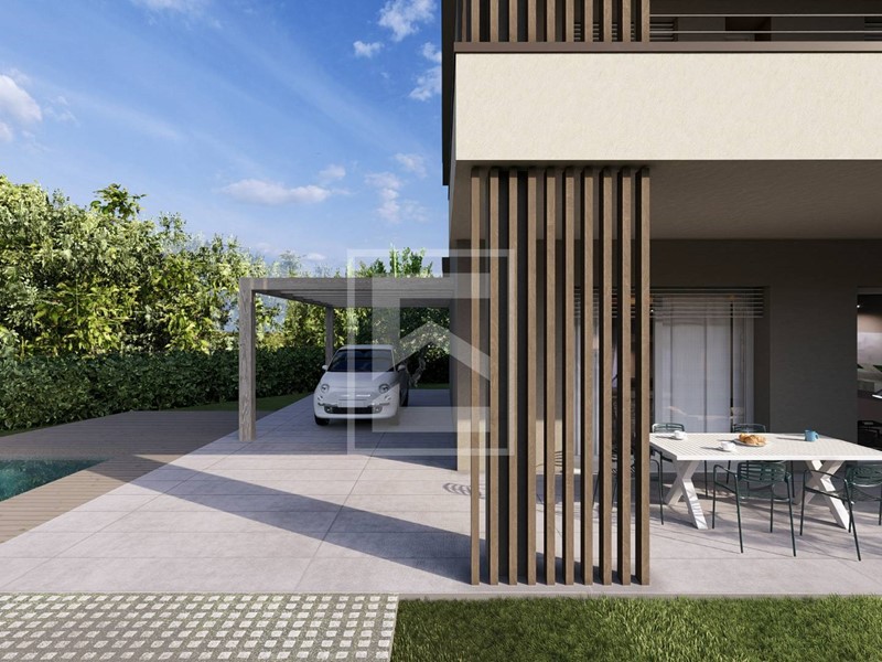 La villa angolare offre al piano terra un ampio soggiorno con cucina di 44 mq, perfetto per vivere in un ambiente spazioso e luminoso che si affaccia sul loggiato. Un disimpegno separa la zona giorno dalla lavanderia, ricavata nel sottoscala, e un bagno di servizio. Al piano primo si trovano 3 camere da letto, tra cui una matrimoniale con bagno privato, e un ulteriore bagno a servizio delle altre due camere. La villa sorge su un lotto di circa 320 mq, un giardino di circa 190 mq che garantisce privacy e uno spazio esterno perfetto per momenti di relax, e un posto auto doppio coperto da carport.