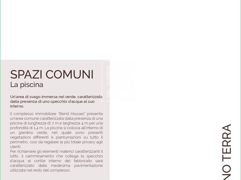 Le finiture interne sono di alta qualità, con pavimentazioni in ceramica di prima scelta e possibilità di scegliere materiali extra come parquet, mentre le porte interne ed esterne sono realizzate con materiali resistenti, comprese le porte blindate per una maggiore sicurezza. Le parti comuni comprendono un giardino ben curato con piscina, e larea di manovra è pavimentata con materiali che si integrano armoniosamente con lambiente circostante. La privacy degli abitanti è garantita da una piantumazione strategica nel giardino.