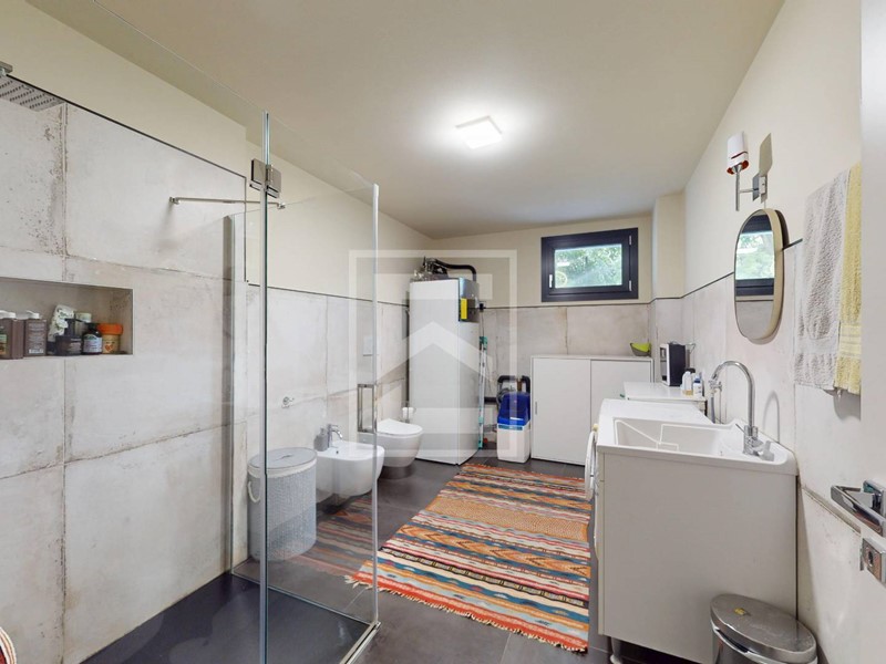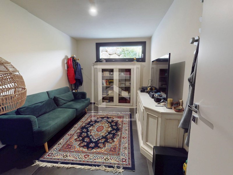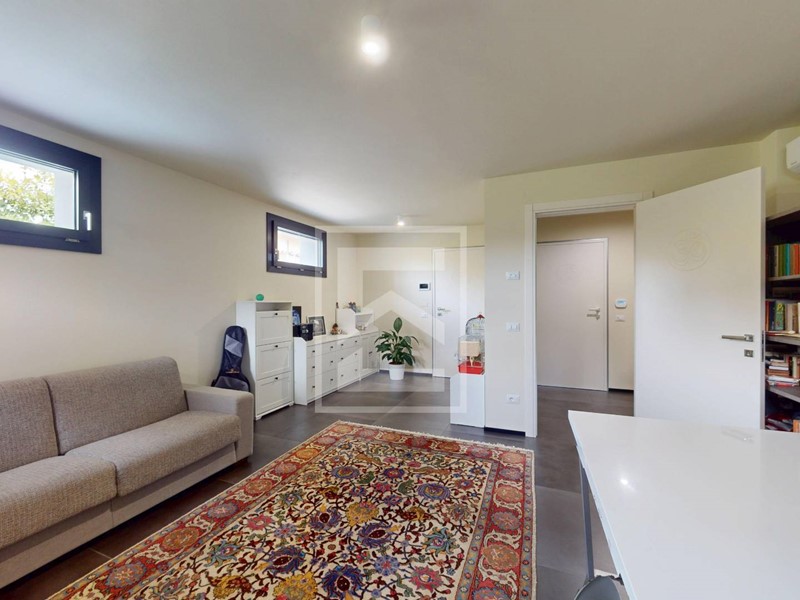 Il piano seminterrato è estremamente luminoso grazie alle grandi finestre che si affacciano sul giardino, creando un'atmosfera accogliente in tutte le stanze. Dispone di due ingressi separati: uno conduce direttamente a uno studio, mentre l'altro porta a un corridoio che si collega ad altri ambienti. Da qui si accede a un ampio bagno lavanderia, una camera hobby e un garage di 42 mq, perfetto per due auto o come spazio extra per archiviazione e attrezzature. Le scale interne conducono al piano rialzato.