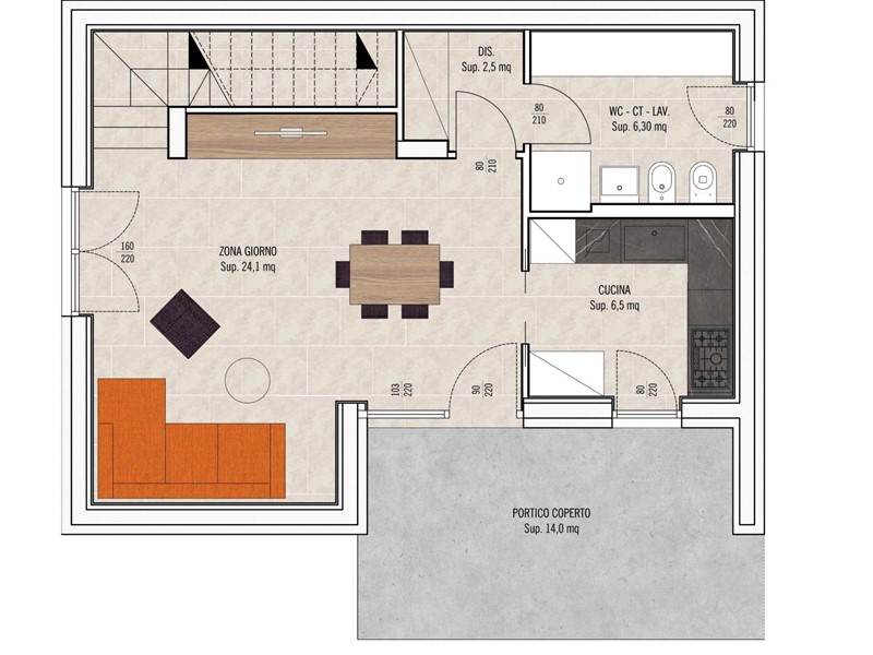 Piano terra: cucina (anche openspace), ampio soggiorno con portico, servizio, locale impianti e porticato auto coperto