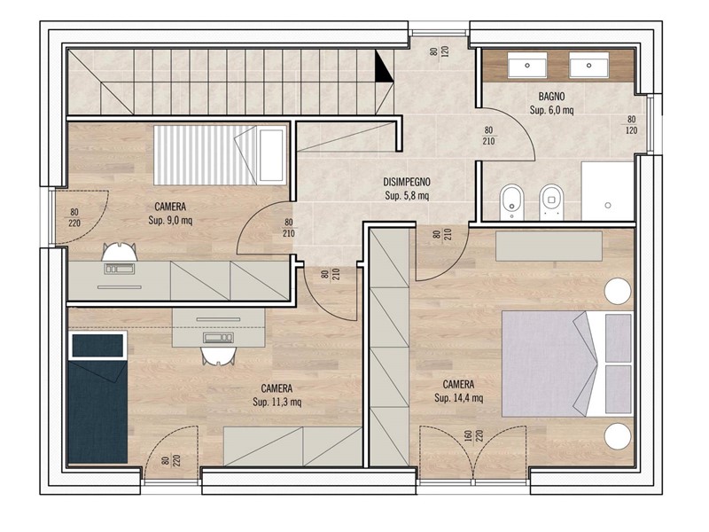 Piano primo: tre camere da letto, ulteriore bagno e travi a vista in legno, per unatmosfera calda e accogliente.