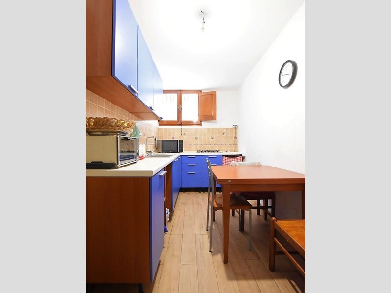 Dal soggiorno, luminoso e arioso, puoi uscire direttamente sul vicolo che collega al garage privato, mentre la cucina semiabitabile e il bagno con finestra completano il piano terra.
