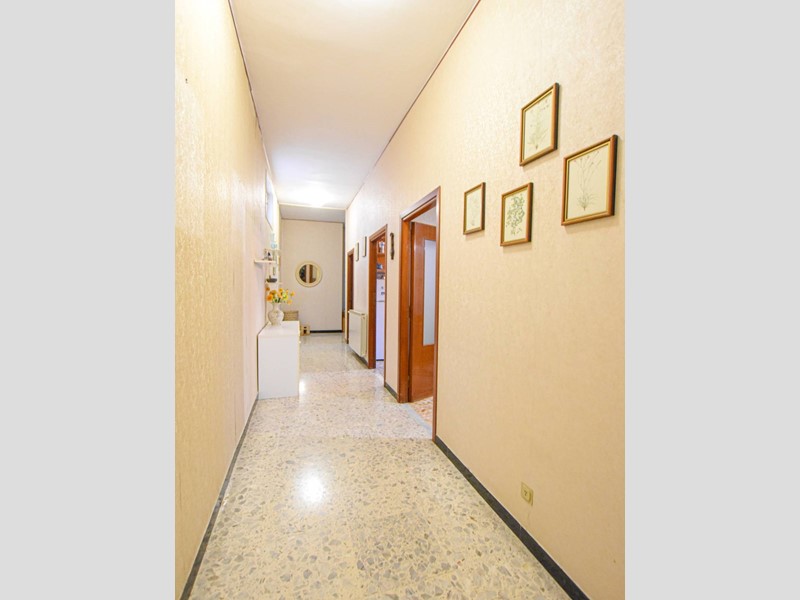Proseguendo, il corridoio porta a un'ampia sala da pranzo e alla cucina con uscita sul secondo terrazzo, ideale per chi desidera modificare in un open space luminoso e conviviale. Completano la zona giorno due bagni finestrati, uno con doccia e uno adibito a lavanderia, seguiti da due camere da letto matrimoniali.
