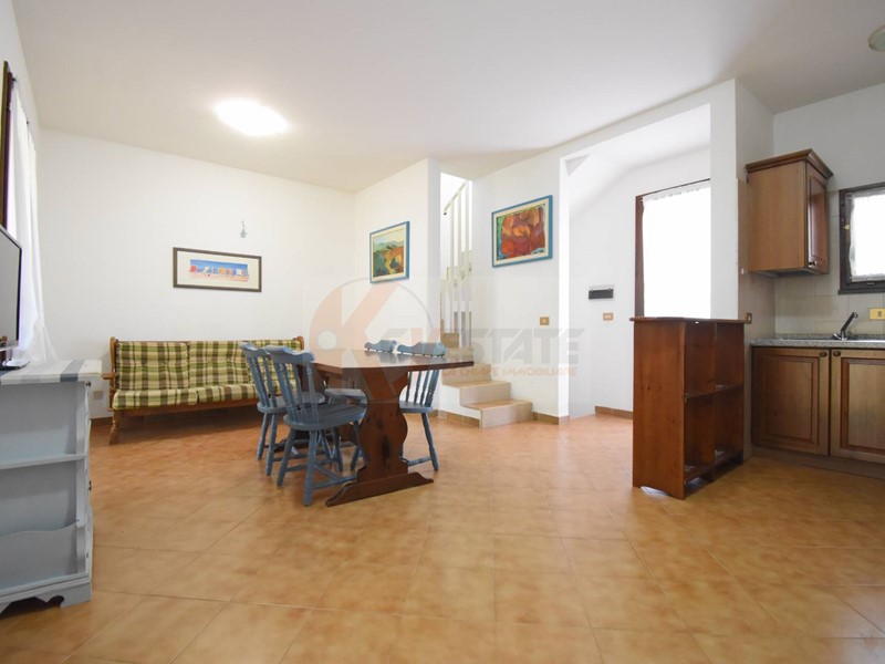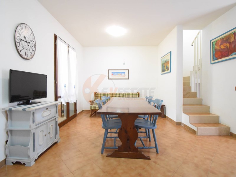 Distribuzione e spazi: l'interno è suddiviso con zona living con angolo cucina, accesso al giardino esterno con veranda, due camere da letto al piano superiore con un bagno completo e finestrato, due camere al piano inferiore con bagno e ripostiglio. Questa configurazione è ideale per una famiglia o per chi vorrebbe una soluzione come investimento nel periodo estivo.