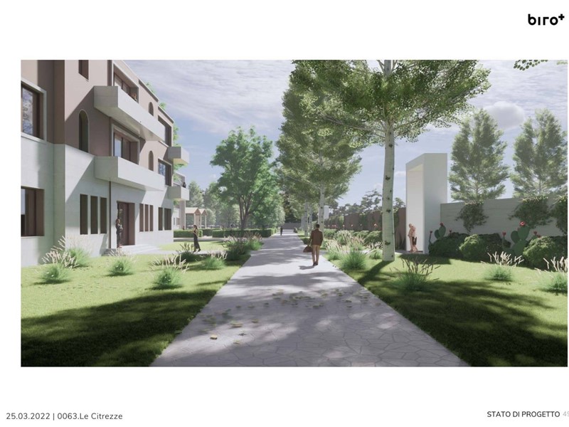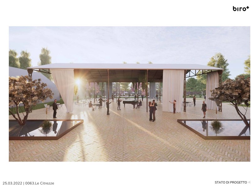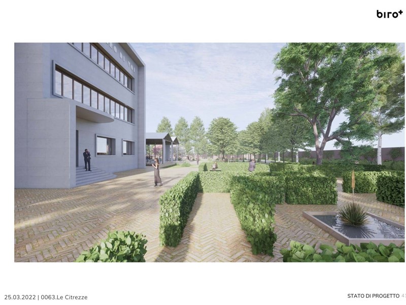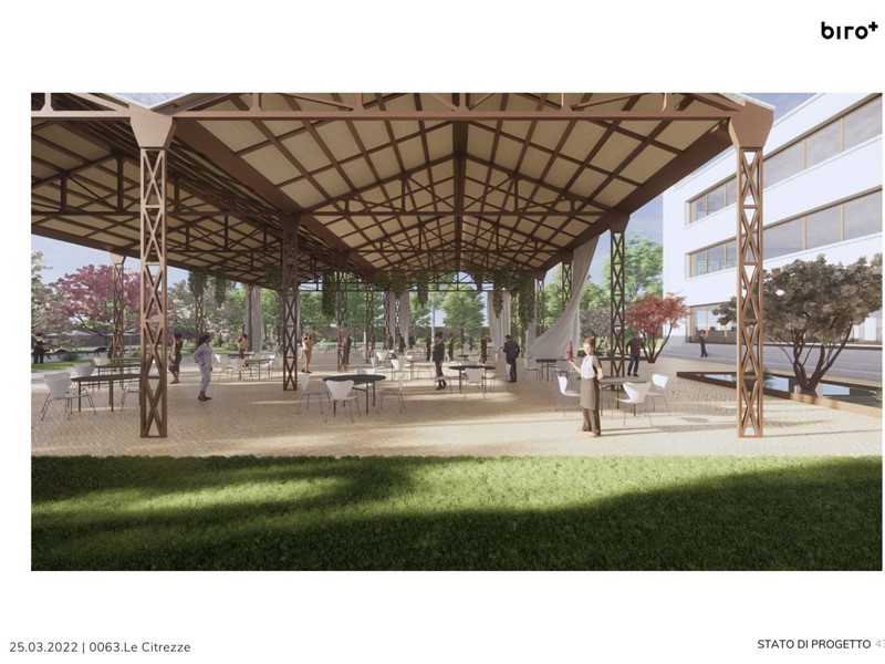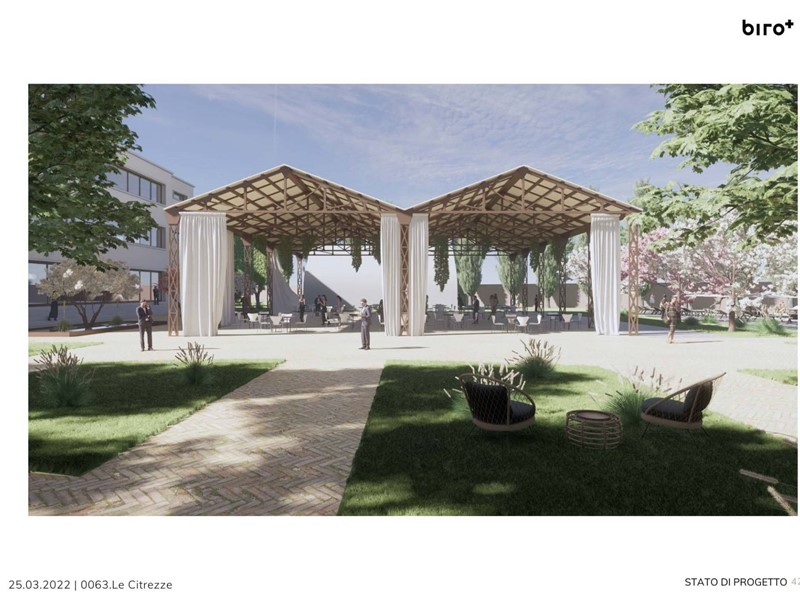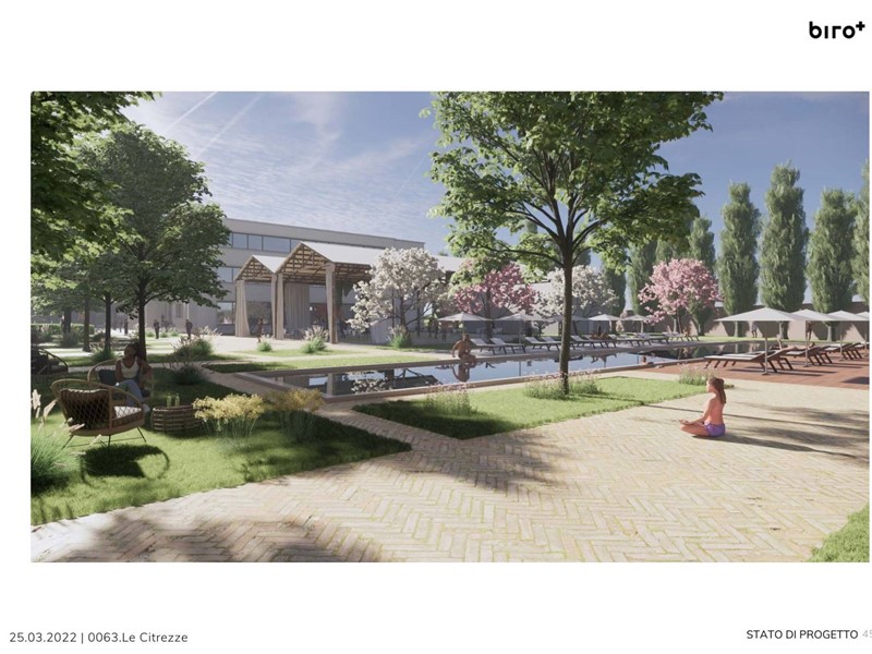 Le aree esterne, per un totale di circa 27.500 mq abbracciano interamente gli edifici suddividendosi in aree a verde e pavimentate, carrabili e pedonali. Gli accessi carrabili sono 3, di cui 2 in corrispondenza diretta degli edifici principali ed uno allestremità del lotto. Questo garantisce una gerarchizzazione dei flussi e la netta distinzione tra aree servite e serventi. Nella zona prospicente il pergolato metallico esistente si prevede la realizzazione di un agrumeto, unarea ristoro esterna, piscina, solarium e zone relax.
