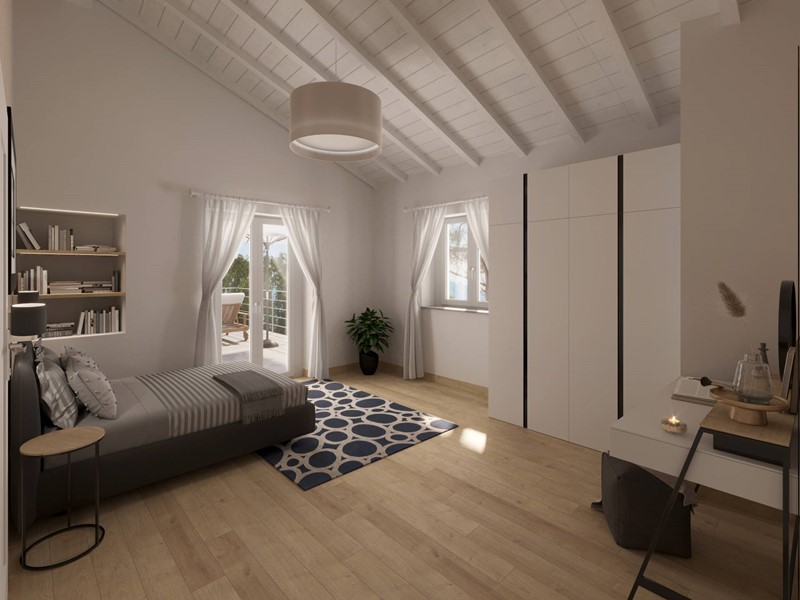 Al piano superiore, la villetta offrirà due eleganti camere da letto, ciascuna con il proprio bagno privato. Questo piano sarà arricchito da una terrazza panoramica che si aprirà verso la vista mare, diventando il luogo ideale per ammirare il paesaggio e godersi momenti di relax.