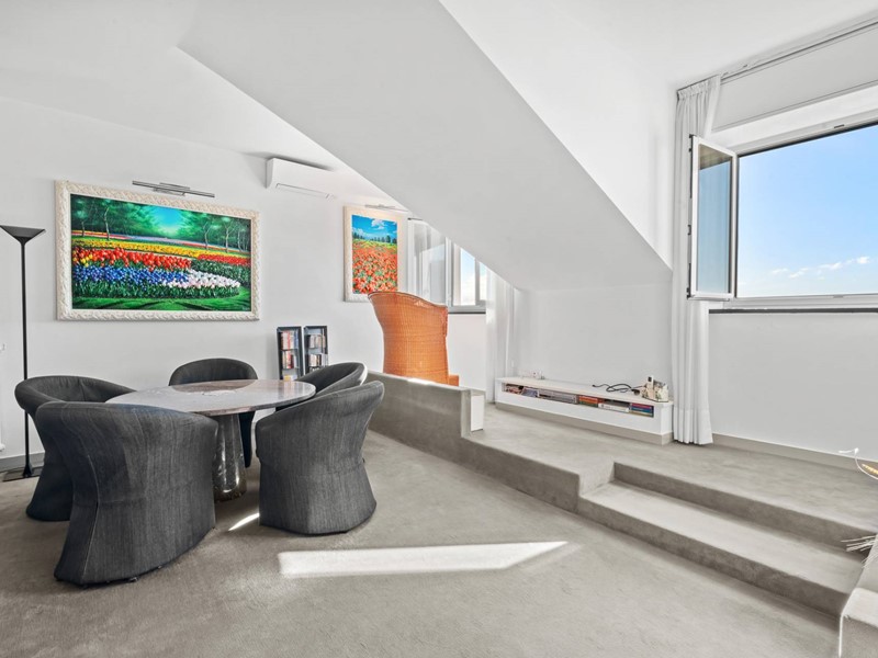 L'ingresso dell'appartamento si apre su un luminoso corridoio che conduce direttamente a un ampio e accogliente salone, caratterizzato da un'atmosfera ariosa e da due finestre che regalano una vista spettacolare sul mare.