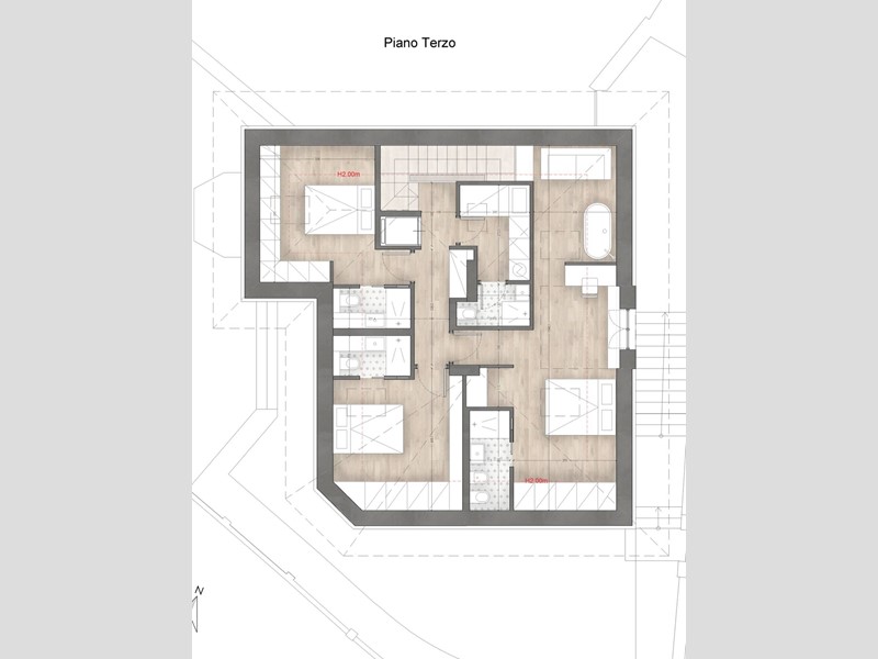 Secondo livello: raggiungibile tramite un ascensore interno, presenta quattro camere da letto, studio e tre bagni.
