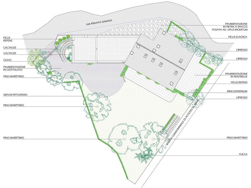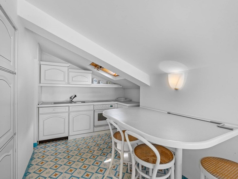 Lultimo livello, accessibile tramite una scala esterna, ospita una dépendance indipendente con un ampio soggiorno dotato di camino, angolo cottura, zona notte e bagno. Questa area si apre su un ampio terrazzo sul tetto con vista panoramica sul mare e sulla vegetazione circostante, ideale per rilassarsi in totale privacy.