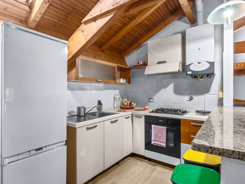 Terzo livello: un'elegante dimora dal carattere raffinato, con un ampio salone impreziosito da travi in legno a vista e una cucina angolare perfettamente integrata. La zona notte comprende una spaziosa camera matrimoniale, una camera singola e un bagno.